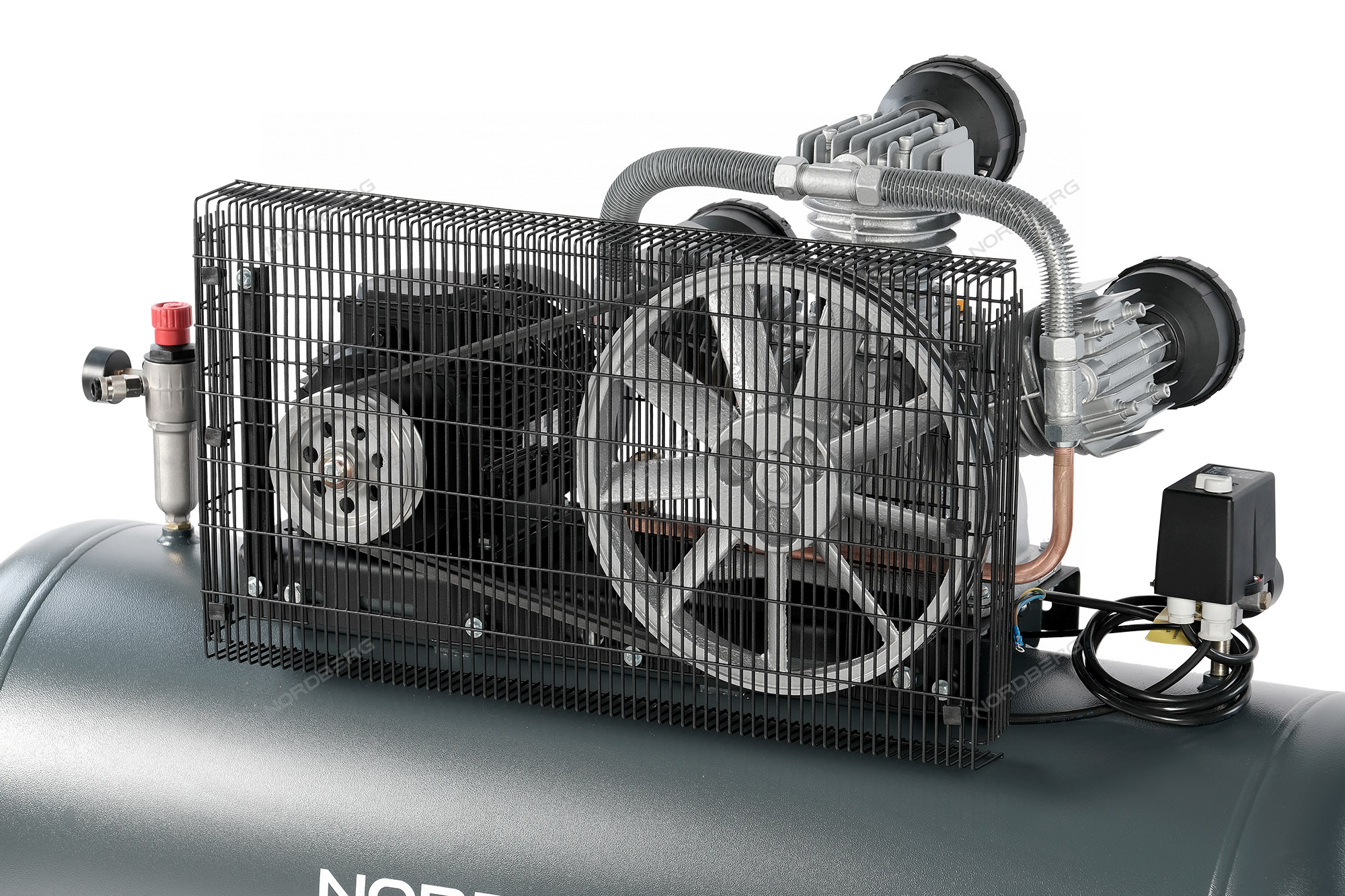 Ременная передача компрессора закрыта решетчатым кожухом, защищающим от повреждений