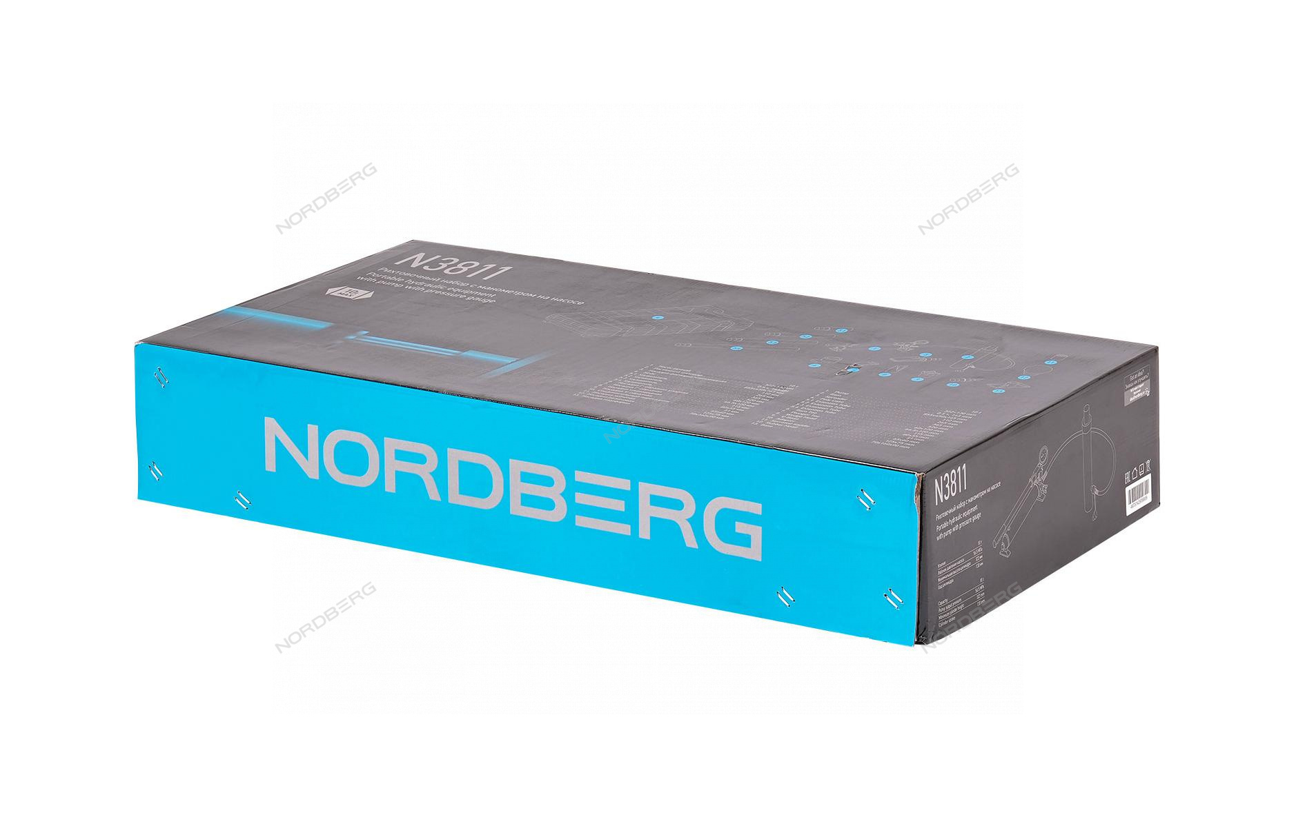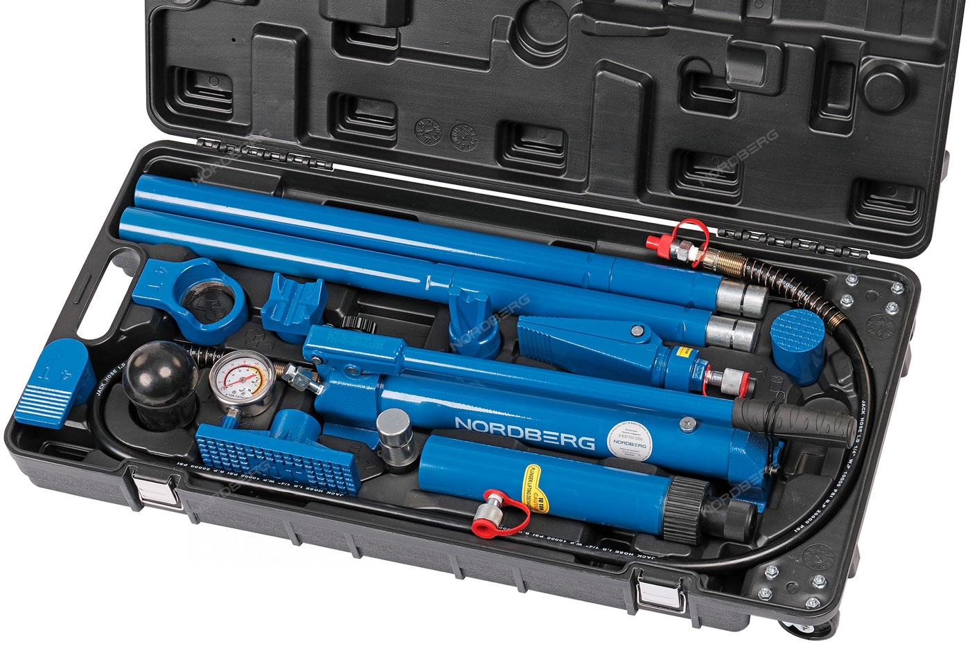 Набор, в который входит гидравлическая растяжка с манометром NORDBERG N3811, включает 15 различных приспособлений для кузовных и рихтовочных работ.