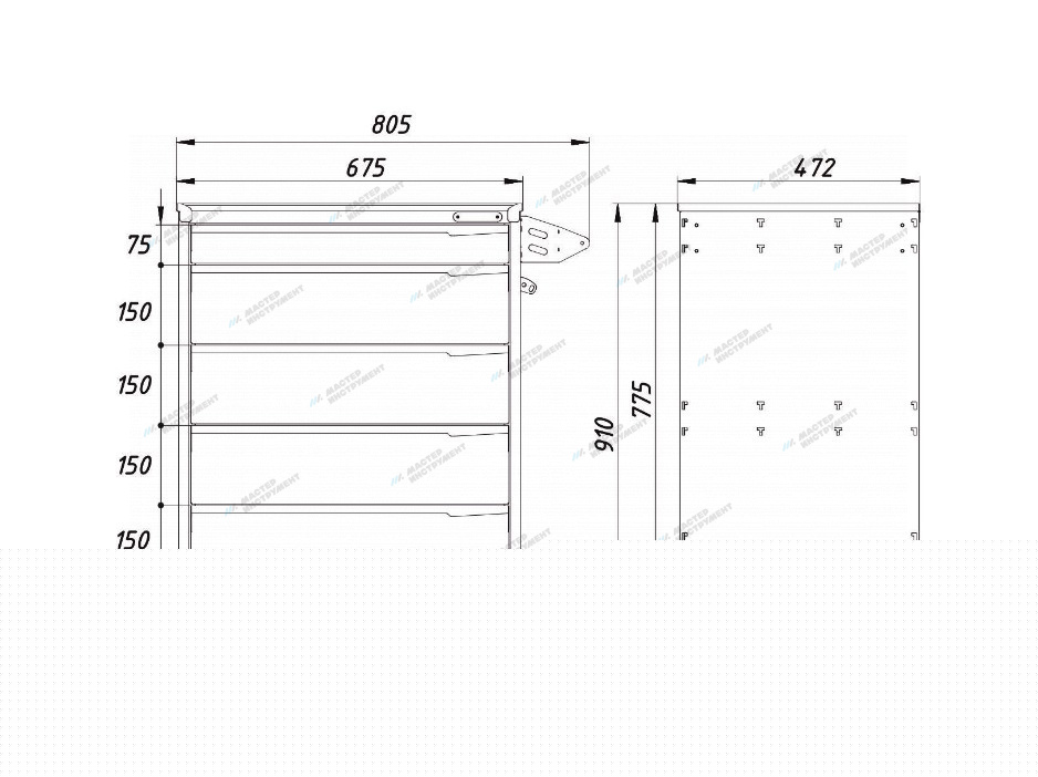 Высота ящиков, мм верхние (1 шт.) - 75, нижние (4 шт.) - 150