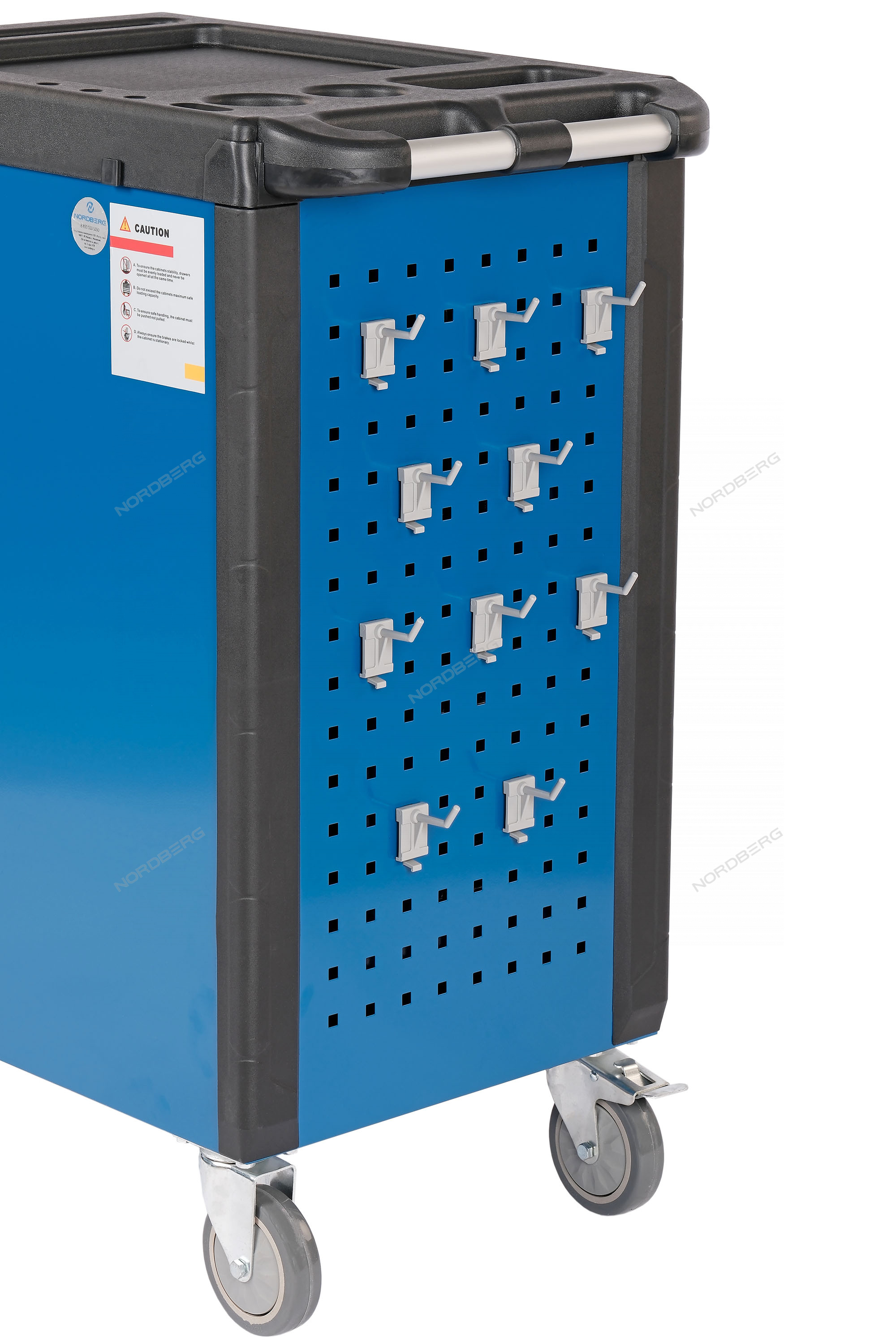 Одна из боковых стенок тележки имеет перфорированную панель, для крепления на ней крючков для инструмента. Крючки идут в комплекте с тележкой.