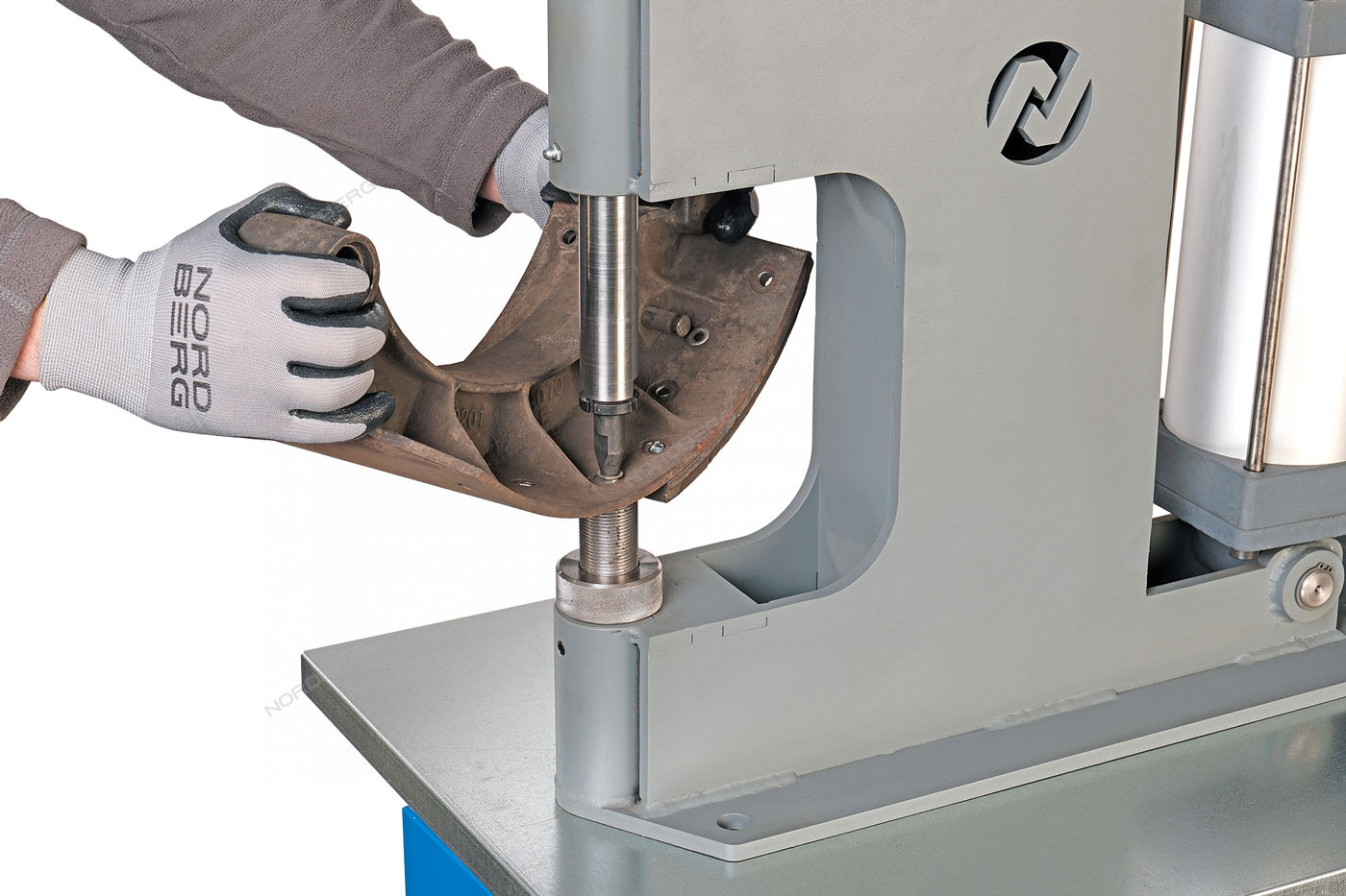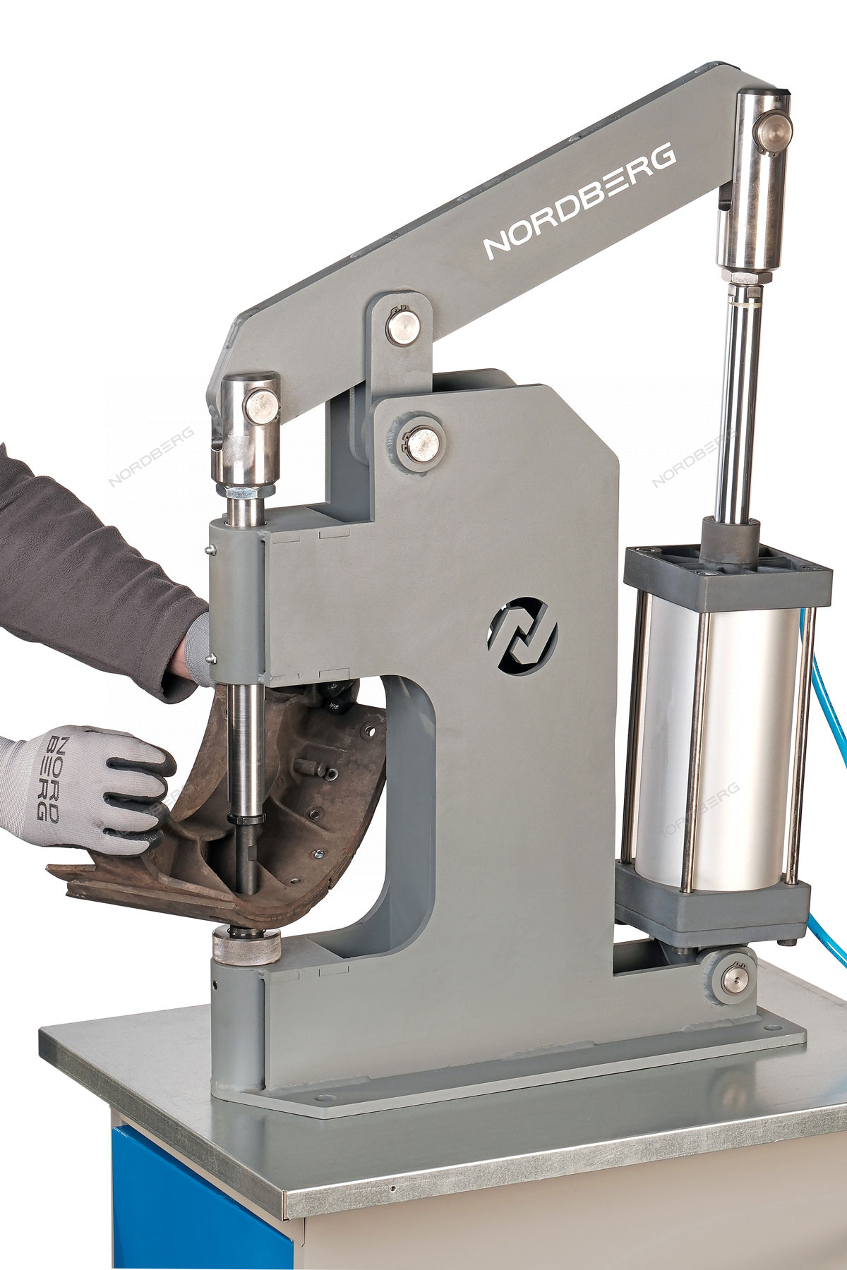 Эксклюзивная разработка компании NORDBERG – комплект, состоящий из пневматического станка для заклепки тормозных колодок NR8P и специальной тумбы для установки станка.