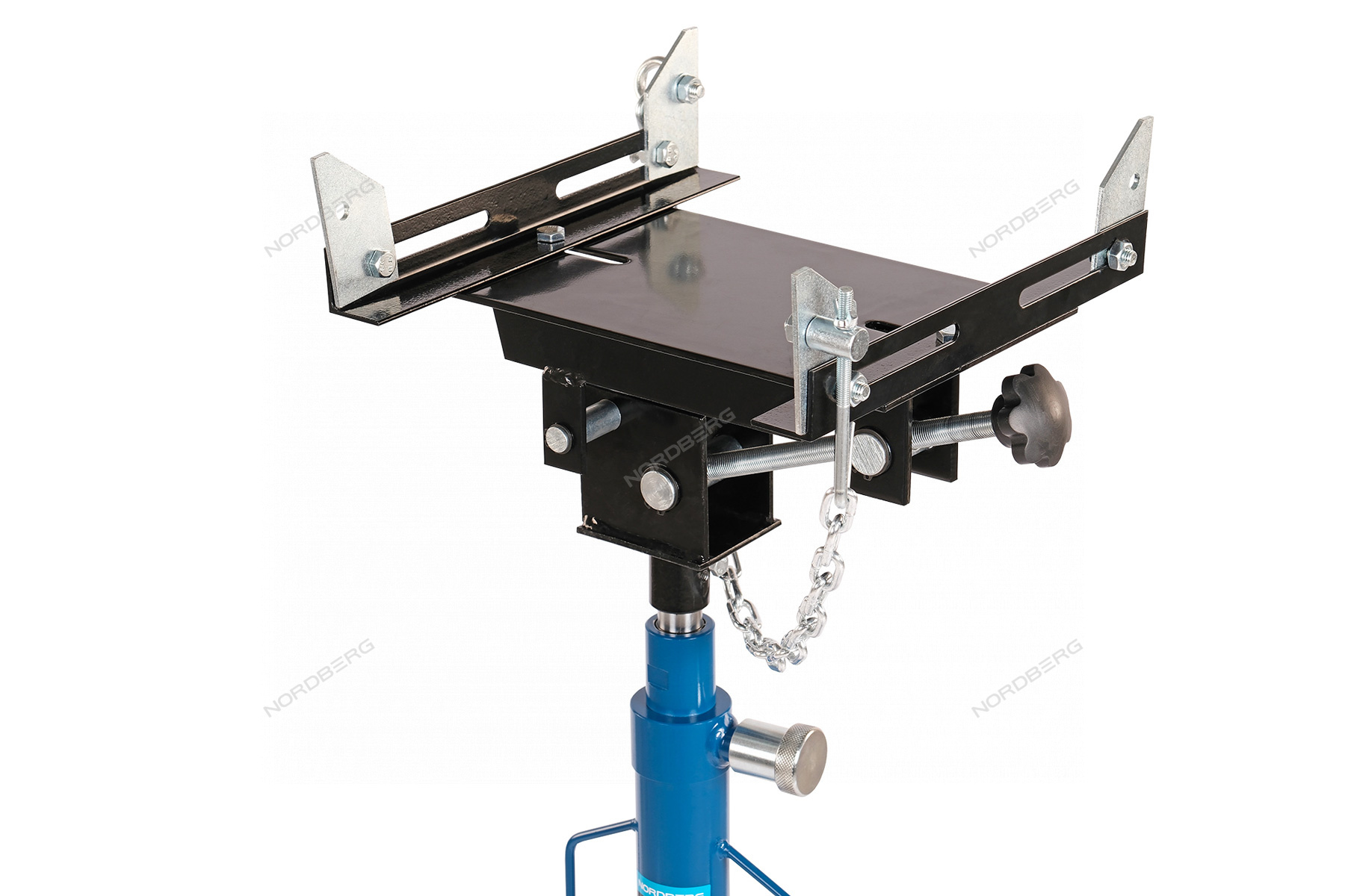 Установочная регулируемая платформа 34х34 см вместо обычной приёмной насадки позволяет надежно расположить на ней агрегаты. Благодаря удобным регулировкам, платформа может изменять длину и ширину расположения ограничителей для лучшего захвата агрегата, а также изменять угол наклона, тем самым позволяя подстроиться под различные конфигурации демонтируемых/монтируемых узлов. Также платформа имеет цепь для обвязки агрегата с целью его жесткой фиксации на платформе во избежание падения агрегата со стойки во время снятия или установки на автомобиль.