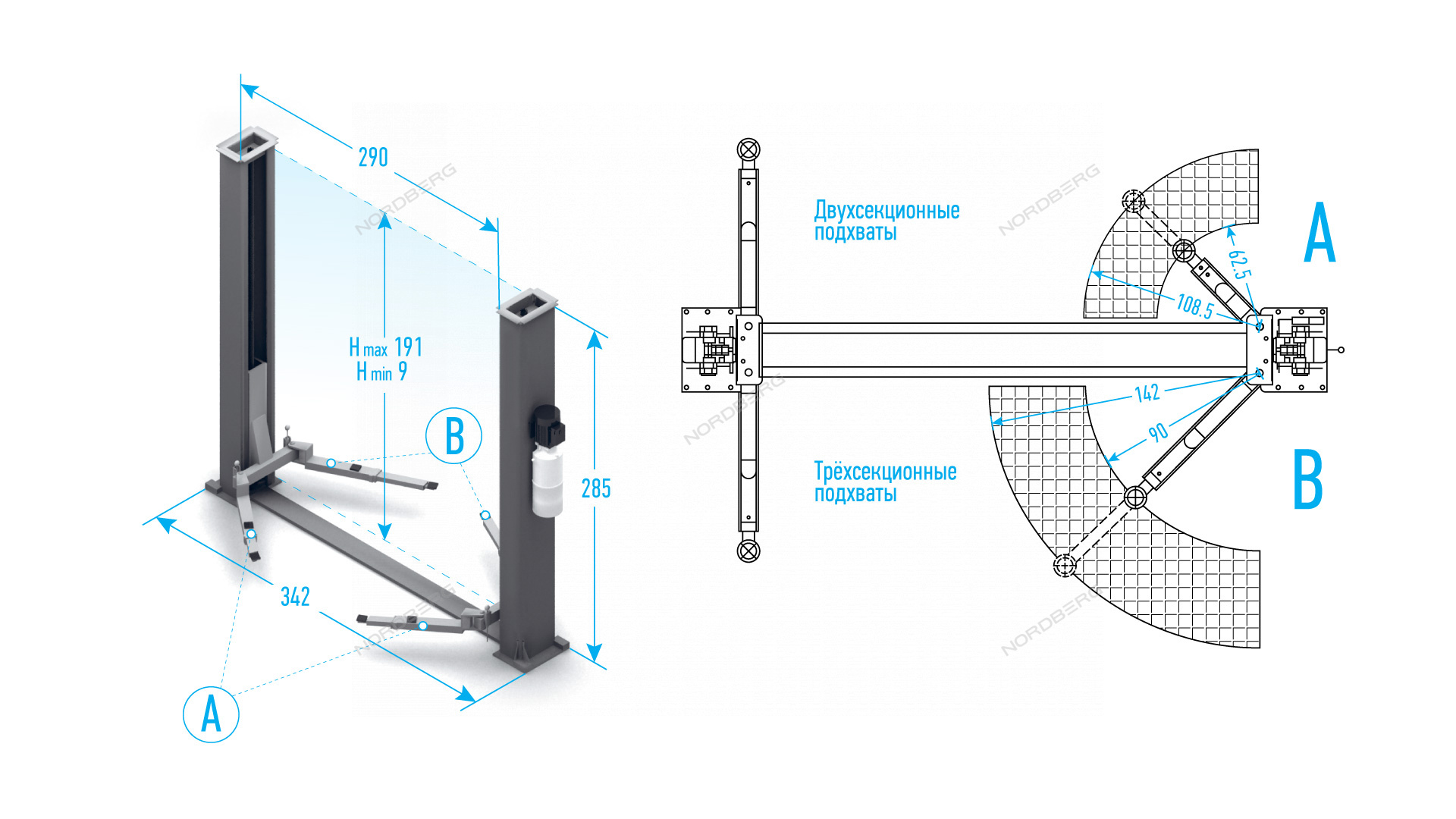 4-тонный электрогидравлический подъемник с нижней тросовой синхронизацией NORDBERG N4120B-4B_3+2_380