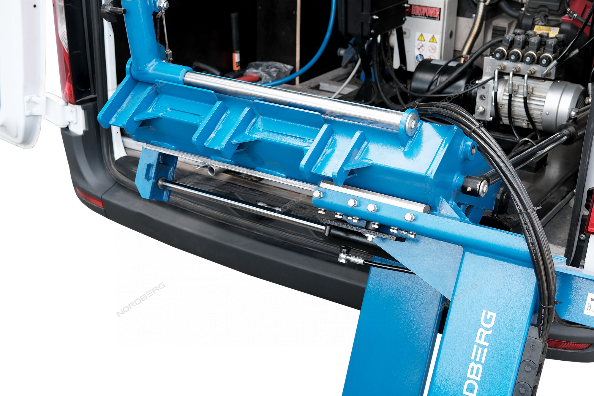 В рабочем положении консоль зажимного устройства наклоняется за пределы двери фургона, что обеспечивает достаточно пространства для нормальной работы с большими колесами, а минимальная рабочая высота - отсутствие необходимости подъема колес.