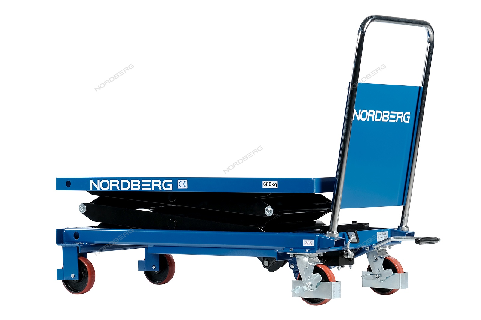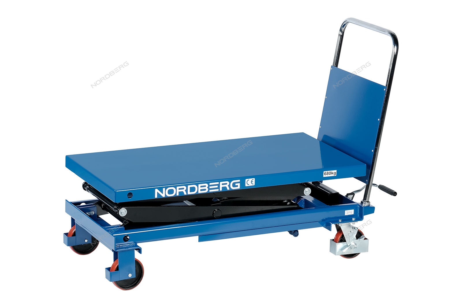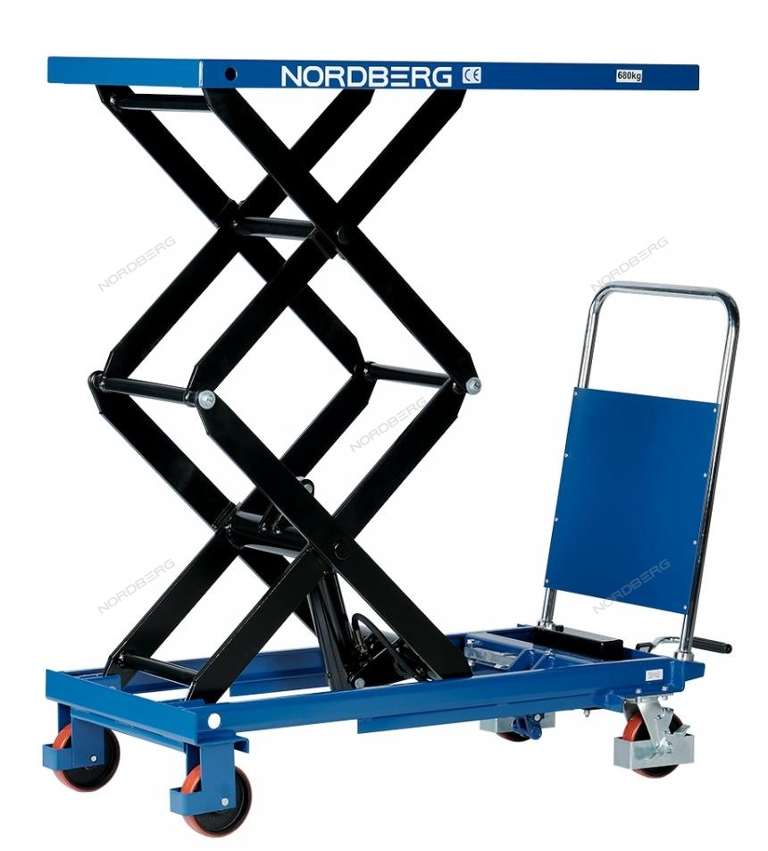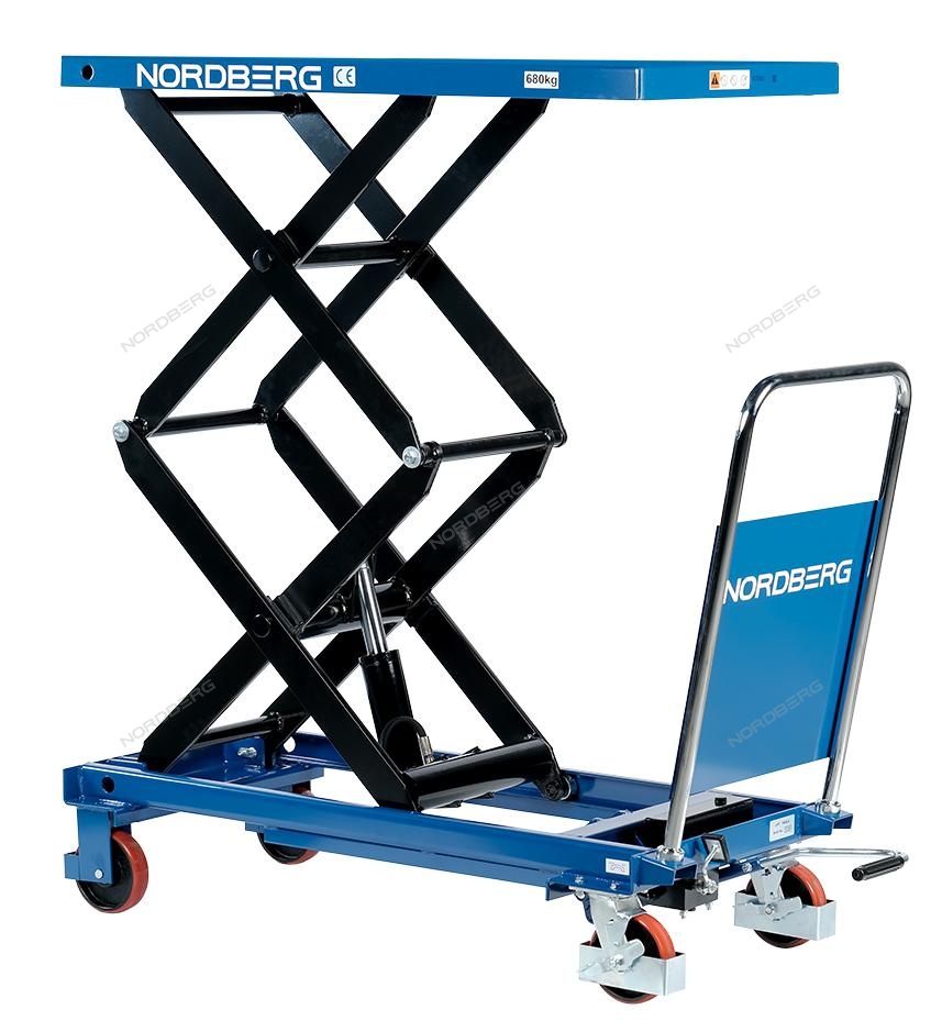 Подъемный гидравлический стол N3T680 предназначен для подъема, опускания и перемещения груза. Конструкция представляет собой совмещение платформенной тележки и стационарного подъемного стола. Подъемный стол имеет гидравлический ножной привод, который позволяет произвести быстрый подъем груза. Опускание производится путем нажатия рычага на ручке подъемного стола. Подъемный стол оснащен стопором, который позволяет надежно закрепить положение в поднятом состоянии. Гидравлическая система позволяет столу опускаться плавно, обеспечивая безопасность работ с грузами. Тележки с подъемным столом с ручным приводом мобильны, эффективны и надежны. Они позволяют не только приподнимать грузы, но и перемещать их на расстояния.