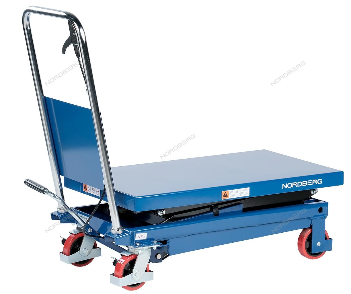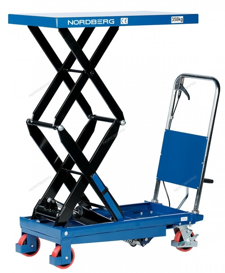 Подъемный гидравлический стол N3T350 предназначен для подъема, опускания и перемещения груза. Конструкция представляет собой совмещение платформенной тележки и стационарного подъемного стола. Подъемный стол имеет гидравлический ножной привод, который позволяет произвести быстрый подъем груза. Опускание производится путем нажатия рычага на ручке подъемного стола. Подъемный стол оснащен стопором, который позволяет надежно закрепить положение в поднятом состоянии. Гидравлическая система позволяет столу опускаться плавно, обеспечивая безопасность работ с грузами. Тележки с подъемным столом с ручным приводом мобильны, эффективны и надежны. Они позволяют не только приподнимать грузы, но и перемещать их на расстояния.