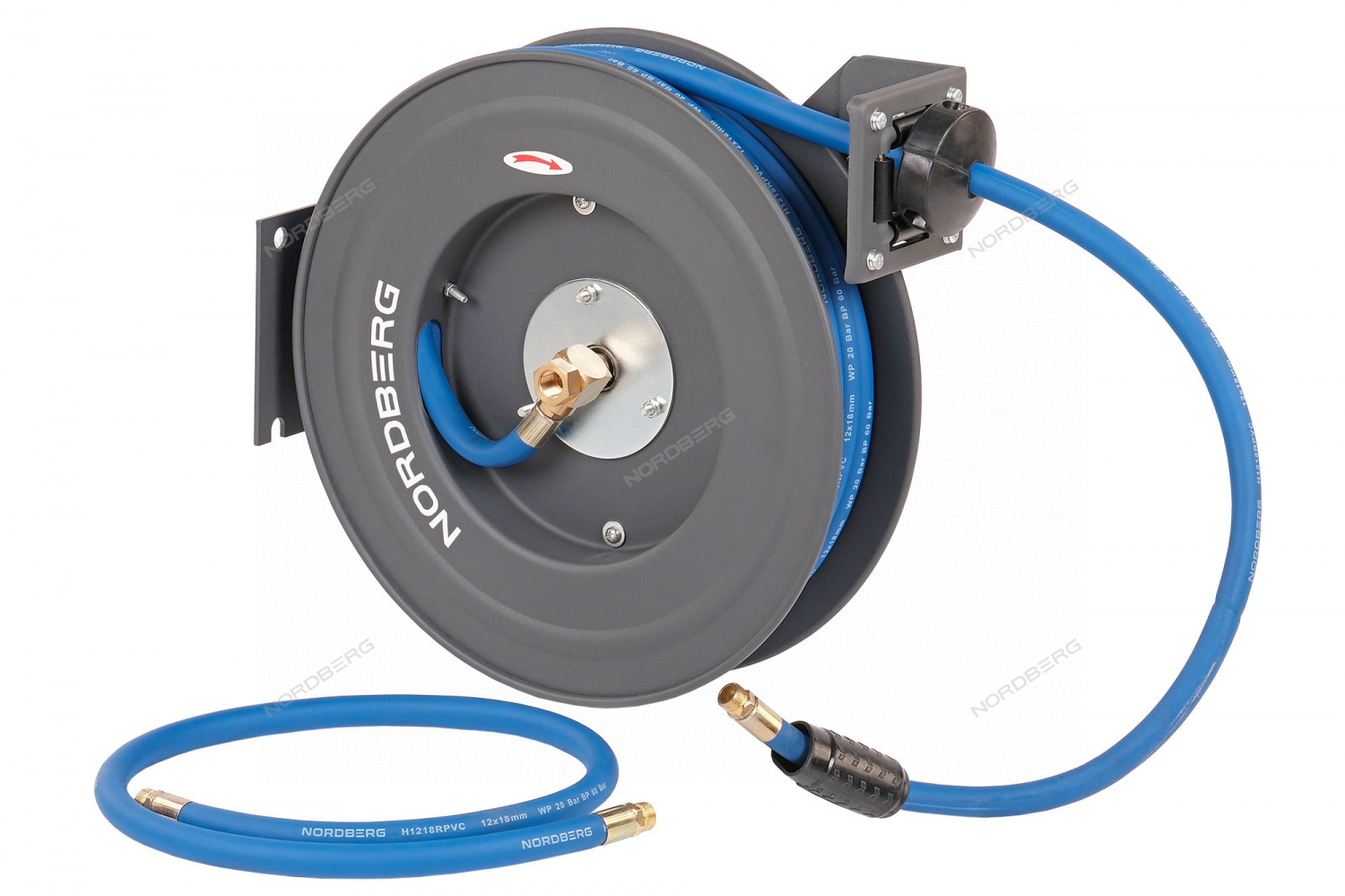 Шланг воздушный на стальной катушке NORDBERG HR1215RPVC используется для подачи воздуха от компрессора к пневмоинструменту.