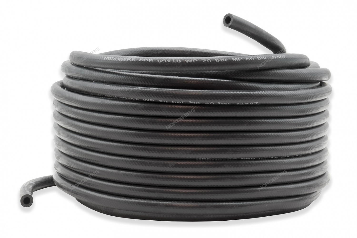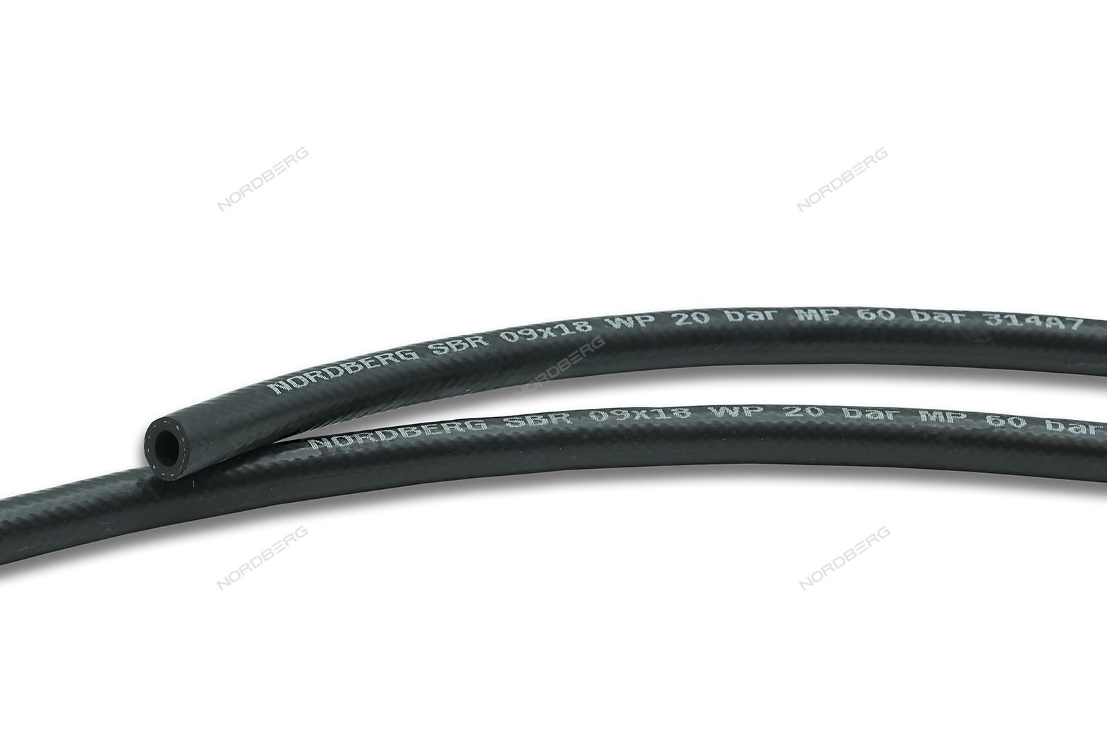 Шланг резиновый с нитяным усилением NORDBERG H918SBR предназначен для подачи под давлением сжатого воздуха, инертных газов. Выдерживает давление до 60 бар и температуру от -35°C до + 70°C