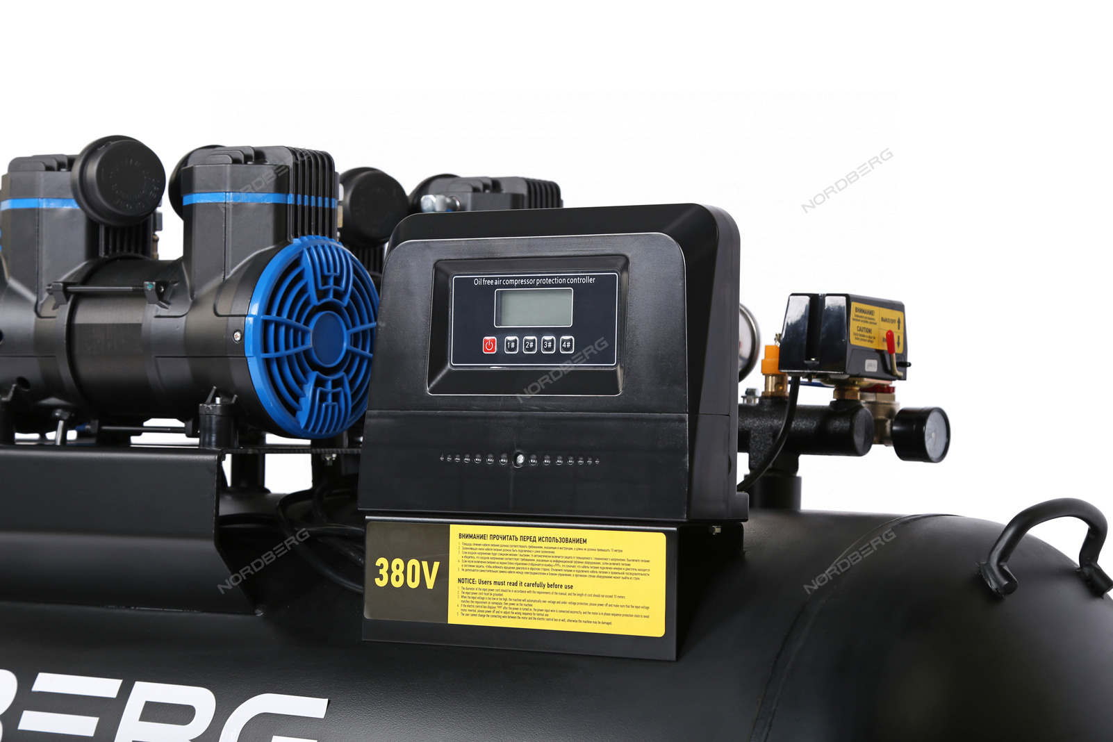 Безмасляный компрессор – отличное решение для применения с краскопультами, продувочными пистолетами и прочим оборудованием. При его использовании нет необходимости устанавливать дополнительные фильтры в воздушную магистраль для улавливания масляной взвеси, в отличие от масляных компрессоров, в результате работы которых на внутренних поверхностях магистралей, шлангов и оборудования могут откладываться продукты разложения масла, уменьшающие пропускную способность и производительность компрессора.В конструкции поршневых групп безмасляных компрессоров NORDBERG используются тефлоновые поршневые кольца с низким коэффициентом трения и высокой стойкостью к износу. За счёт этого температура в цилиндрах и головке цилиндра, всегда остаётся на приемлемом уровне, что позволяет компрессору работать без остановки более продолжительное время по сравнению с другими типами поршневых компрессоров. Компрессор позволяет запускать компрессорные группы как вместе, так и по раздельно, для получения необходимых параметров производительности.