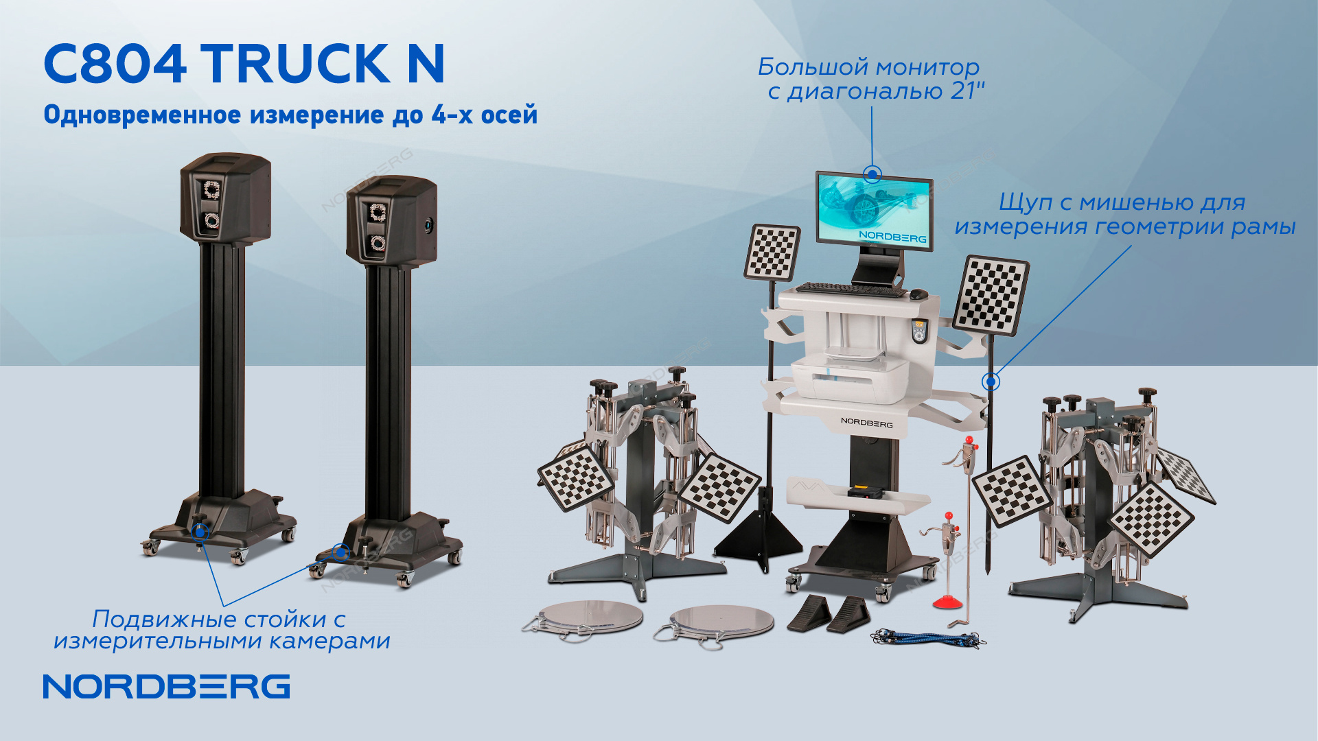 Стенд сход-развал для грузовых автомобилей NORDBERG C804 TRUCK N с технологией 3D предназначен для измерения и регулировки углов установки колес на автотранспортных предприятиях, станциях технического обслуживания, автомобильных заводах и диагностических центрах.