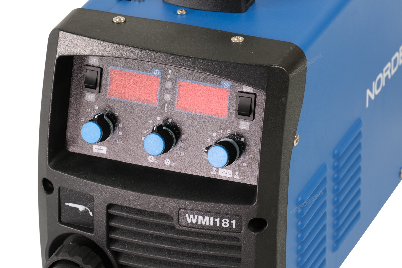 Сварочный ток и напряжение аппарата NORDBERG WMI181 настраиваются с помощью регуляторов (потенциометров) на панели управления.