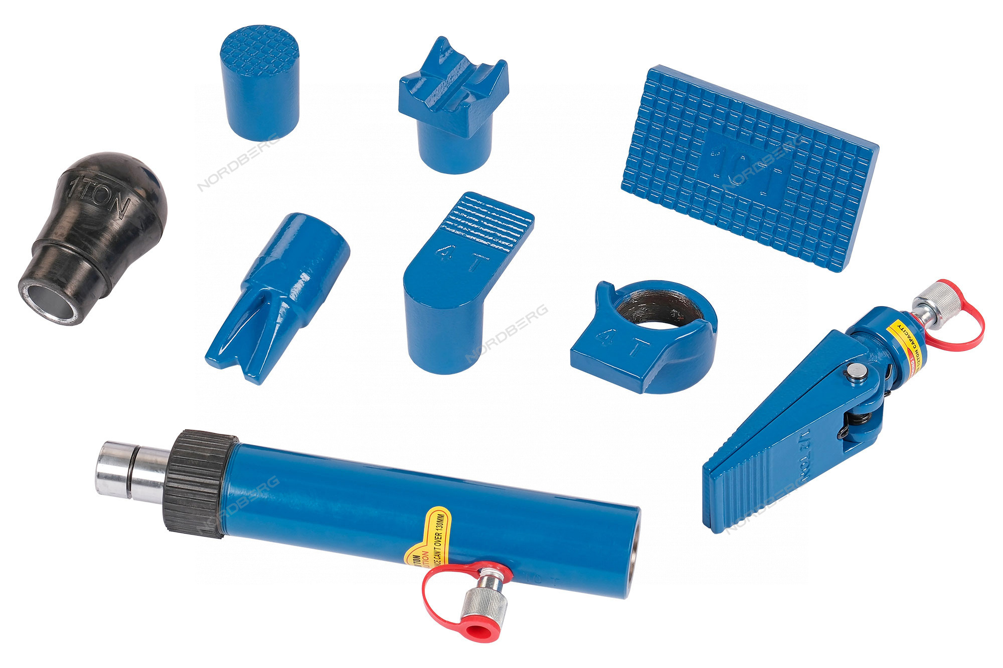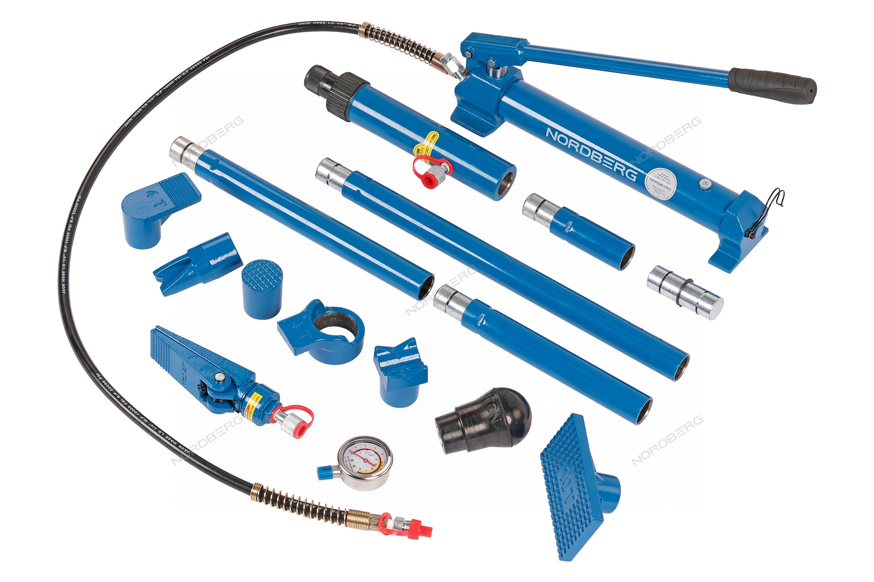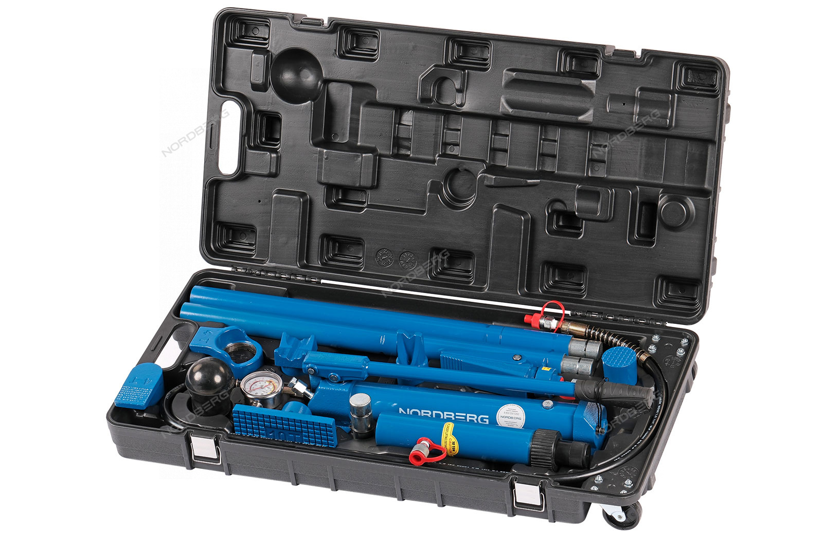 Набор, в который входит гидравлическая растяжка с манометром NORDBERG N3811, включает 15 различных приспособлений для кузовных и рихтовочных работ.