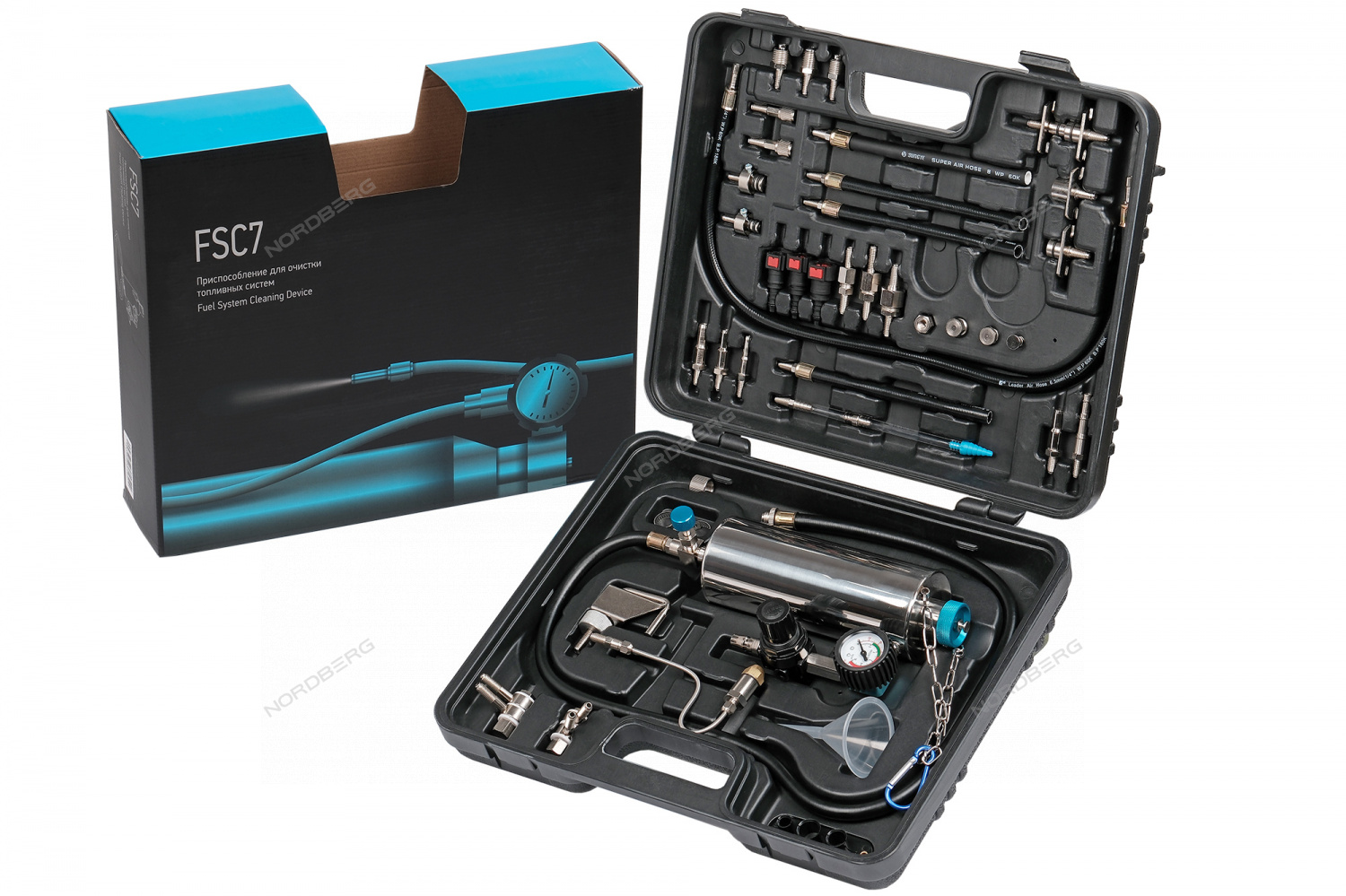 Приспособление для очистки топливных систем в кейсе NORDBERG FSC7 используется для химической очистки топливных систем автомобиля без снятия форсунок, подключаясь к топливной рампе системы вирыска двигателя. Рекомендуется к пспользованио как в автосервисах, так и для личных нужд автолюбителей.