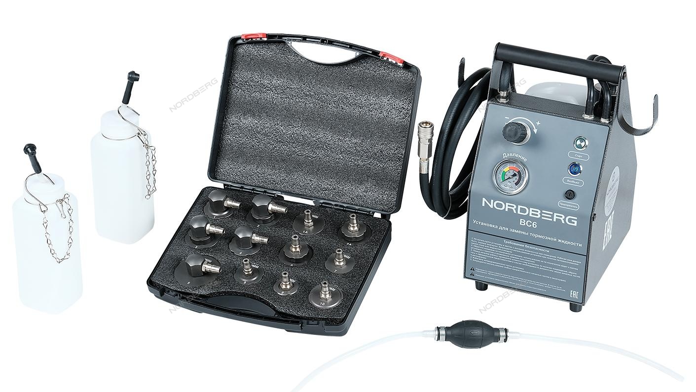 Установка электрическая для прокачки тормозной системы и системы сцепления Nordberg BC6. Емкость бака 5 л. Удаление и замена жидкости в большинстве типов и моделей тормозных систем автомобилей. Подходит для тормозных систем легковых автомобилей и легких грузовиков