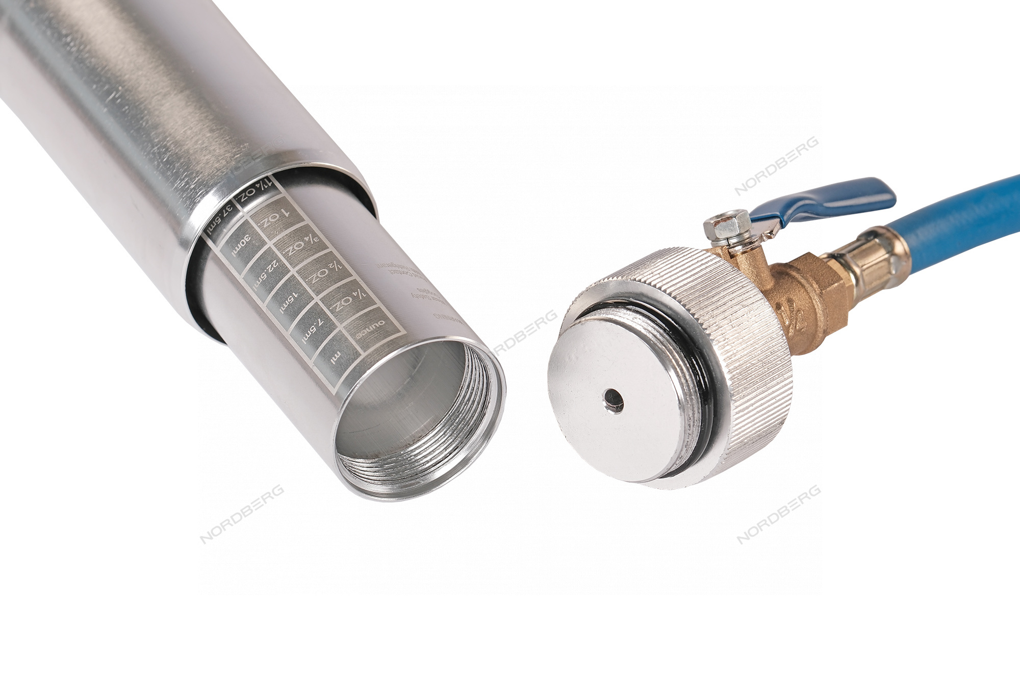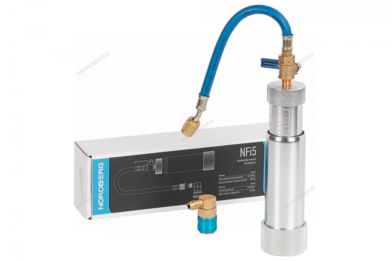 Инжектор NORDBERG NFi5 подключается к порту низкого давления кондиционера через быстросъемную муфту. Необходимое количество масла вводится вручную посредством вращения инжектора по часовой стрелке.