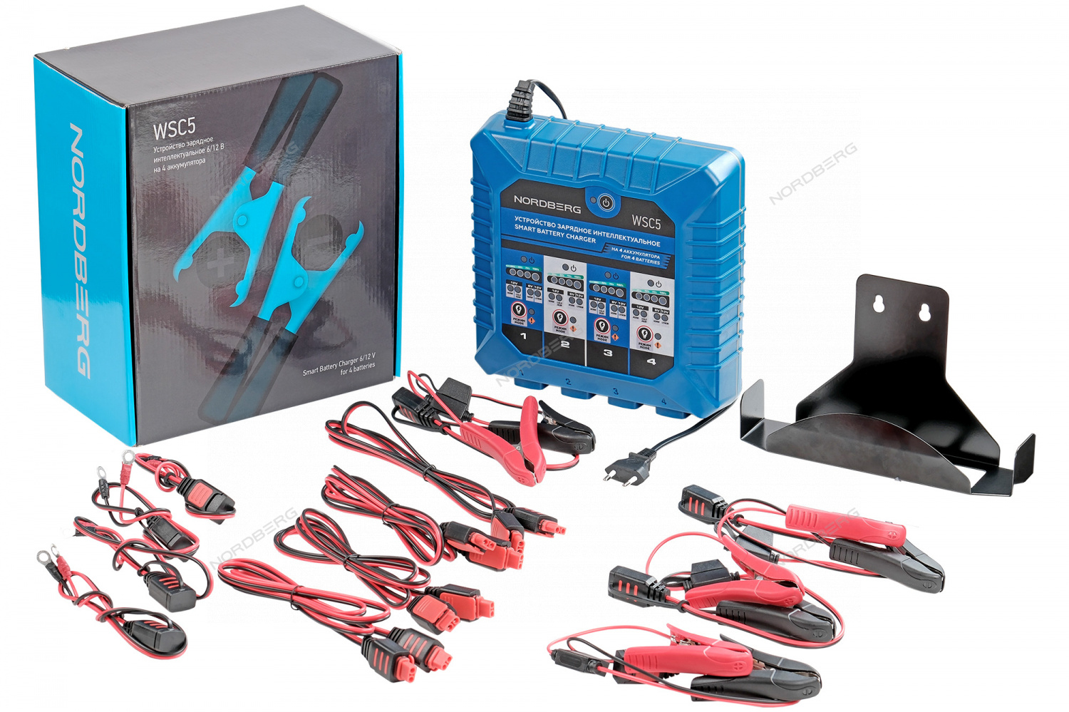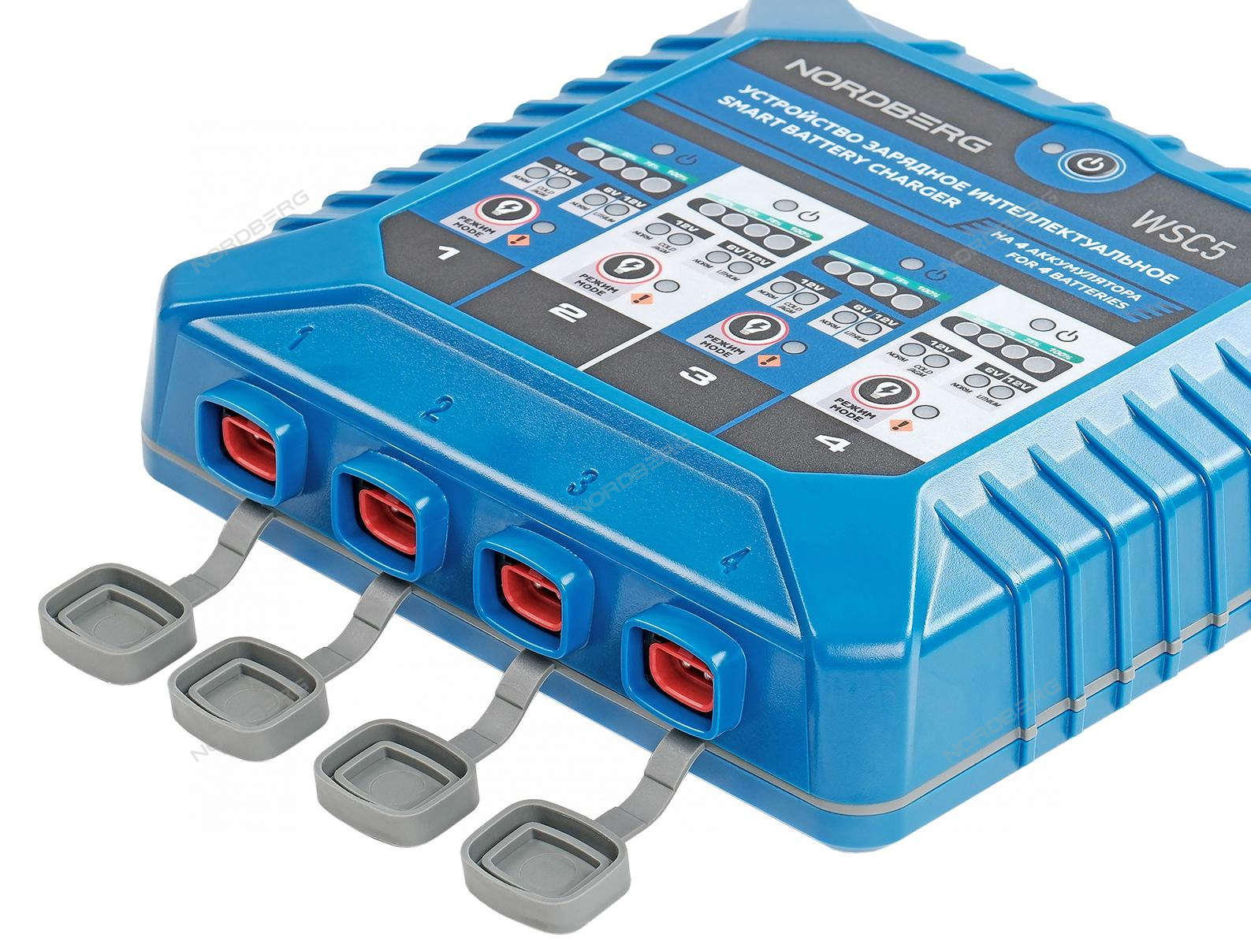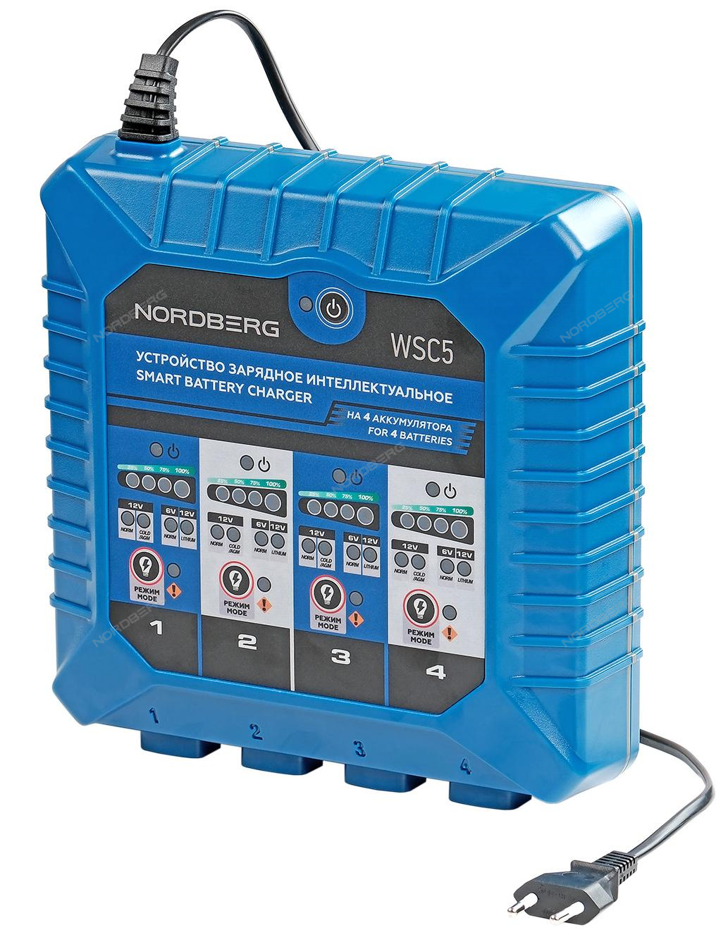 WSC5 для зарядки всех типов свинцово-кислотных аккумуляторов 6В и 12В, 12В литиево-ионных аккумуляторов, включая аккумуляторы WET, MF, EFB, GEL, AGM и LIB. Заряжает на 100% до 4 АКБ одновременно.