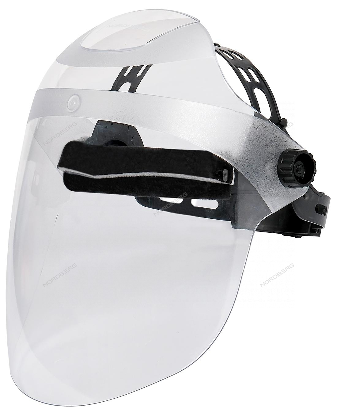 Цельнолитой щиток с большим (310*210 мм.) экраном с панорамным обзором. Профессиональное регулируемое оголовье с храповым механизмом. Поликарбонат, толщина 2 мм.