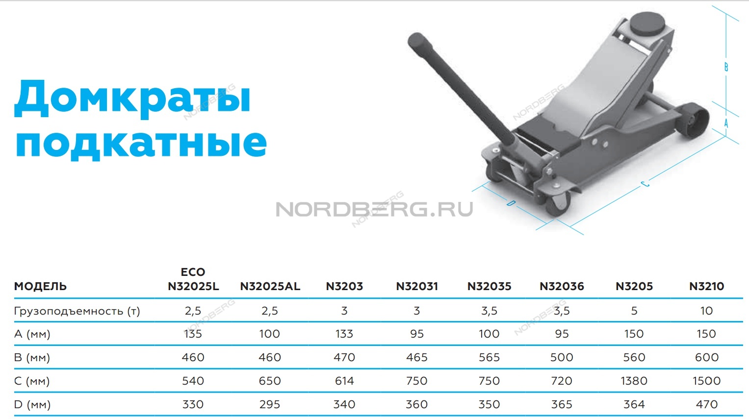 Подкатной удлиненный домкрат NORDBERG N3210 для подъема грузовых автомашин, автобусов и другой тяжелой техники.