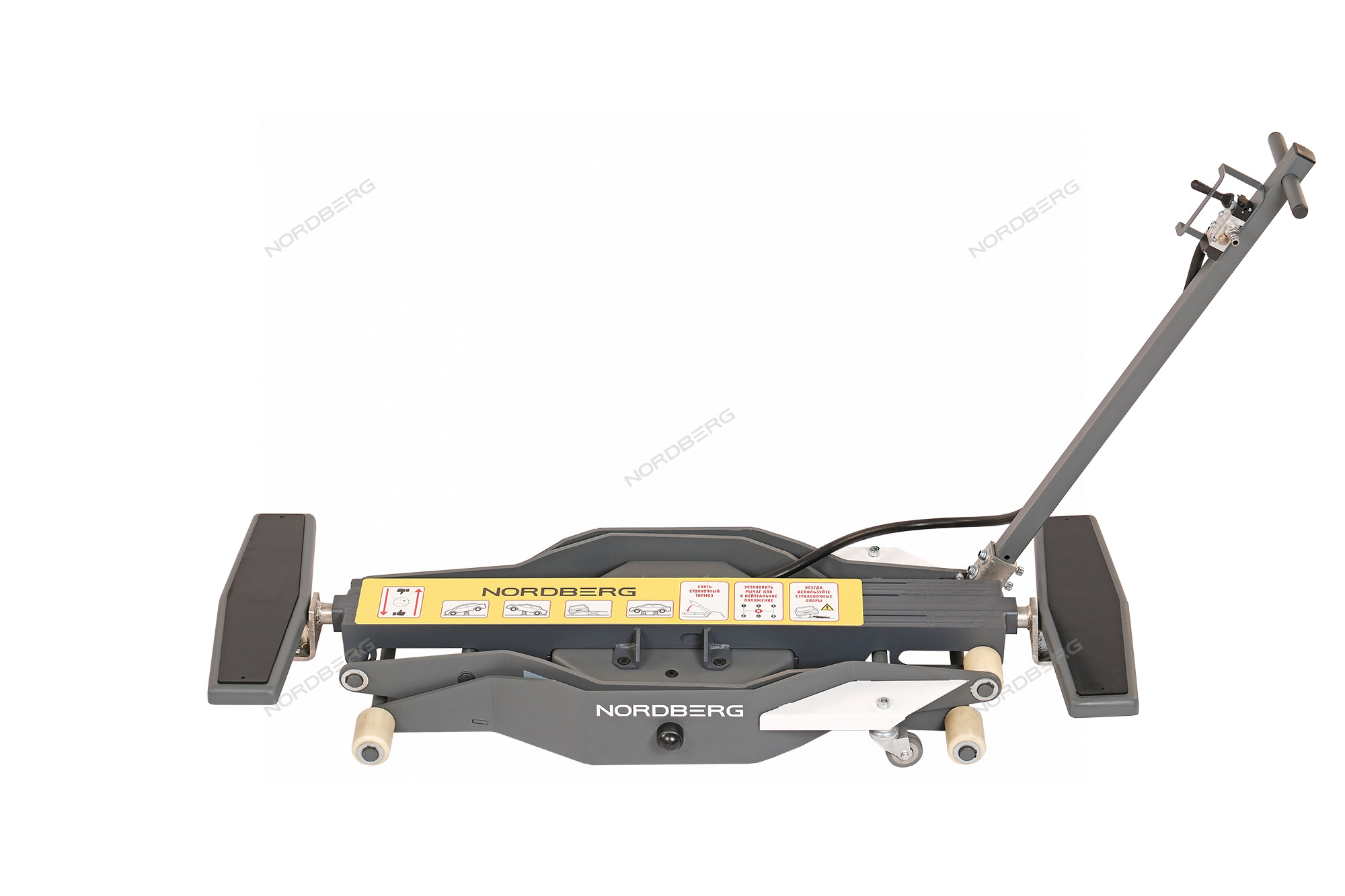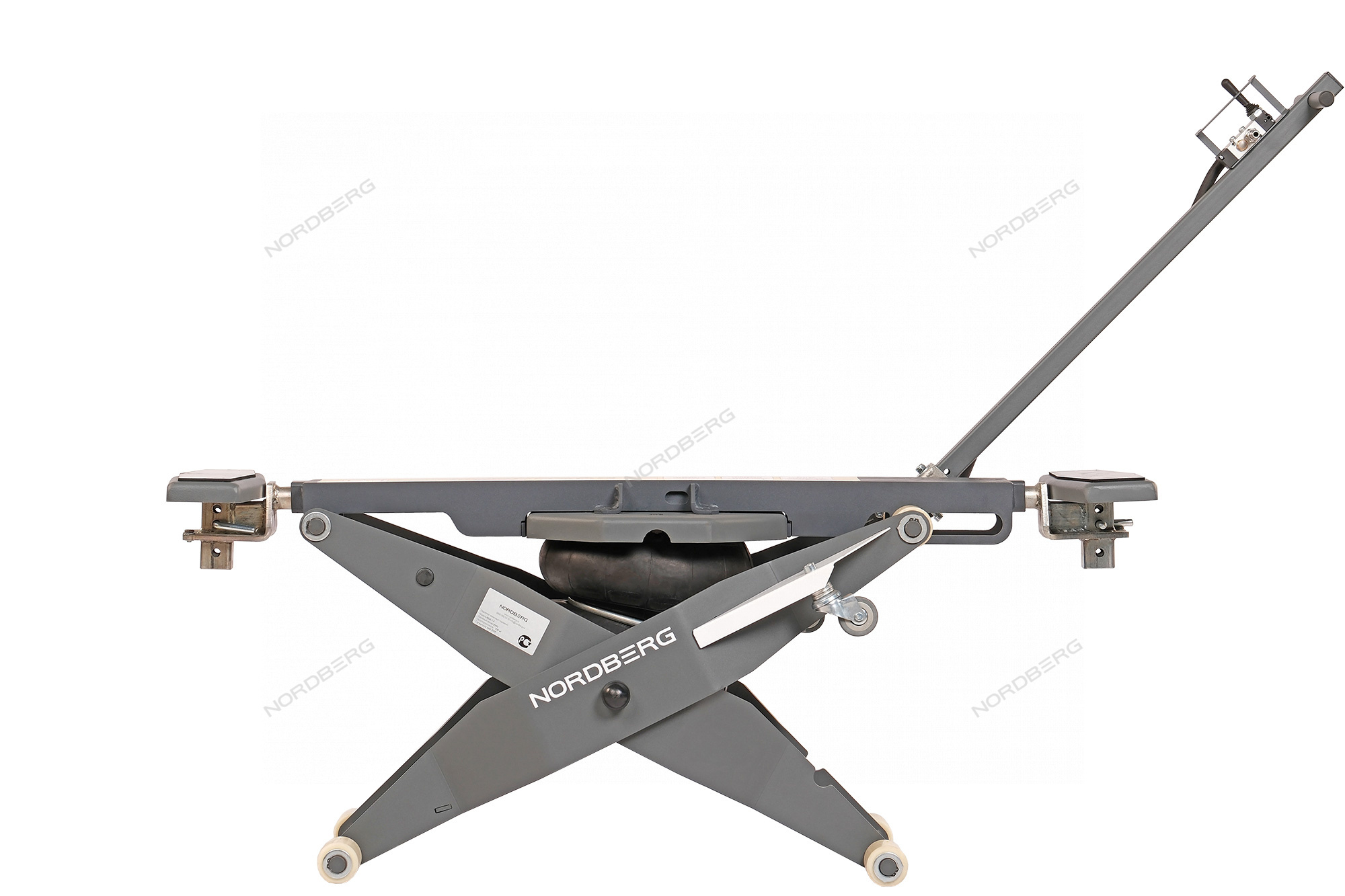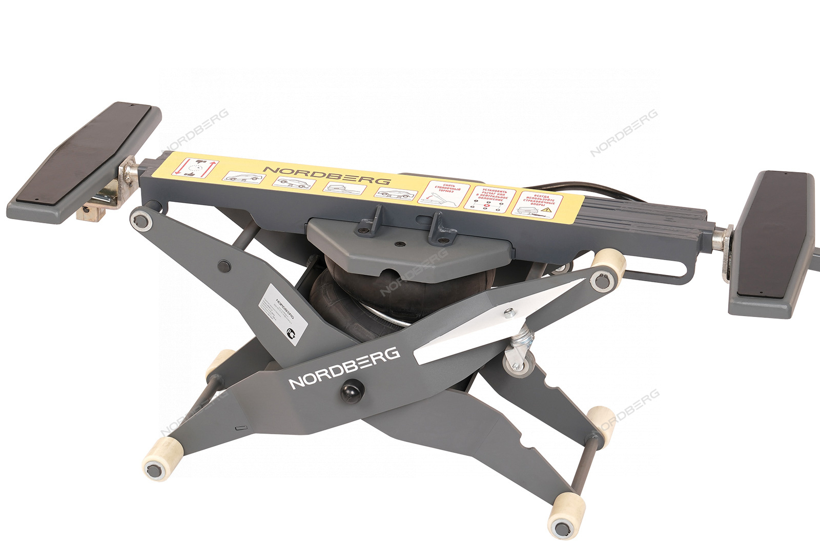 Подъемник, сделанный по типу складной конструкции, управляется при помощи пневмобаллона, что обеспечивает плавное и точное поднятие и опускание автомобиля, а также помогает контролировать высоту подъема.