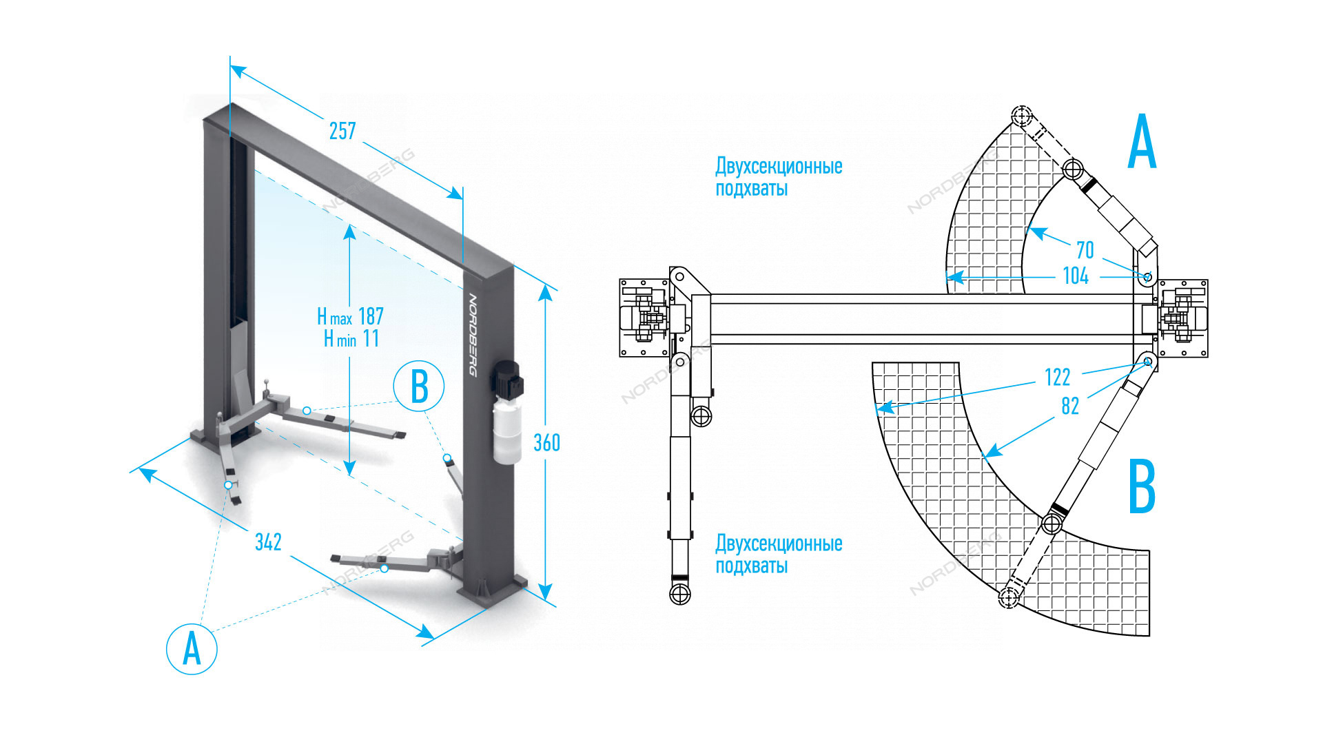 Двухстоечный подъемник NORDBERG N4124H-4B безопасное и надежное оборудование для проведения работ по регулировке углов установки колес, диагностике и ремонту автотранспорта в автосервисах и СТО.