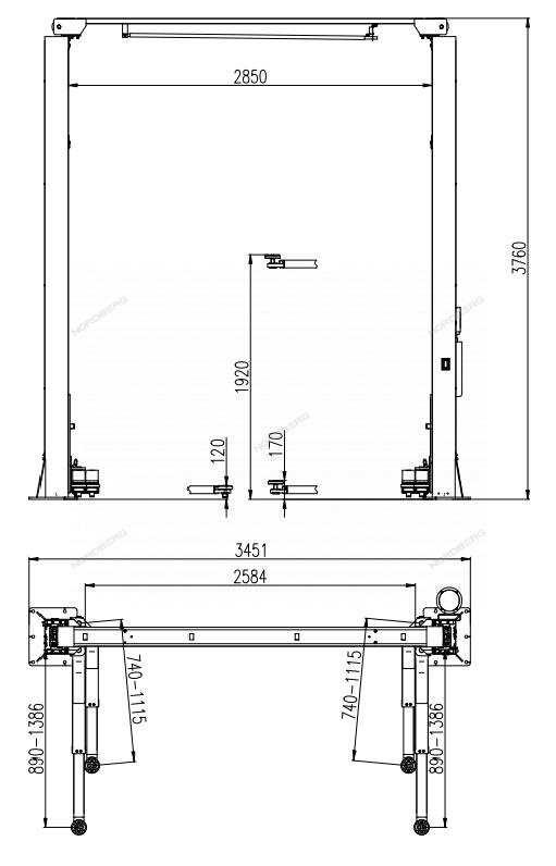 Подъемник 220 В двухстоечный с верхней синхронизацией, г/п 4 тонны NORDBERG N4121H-4T