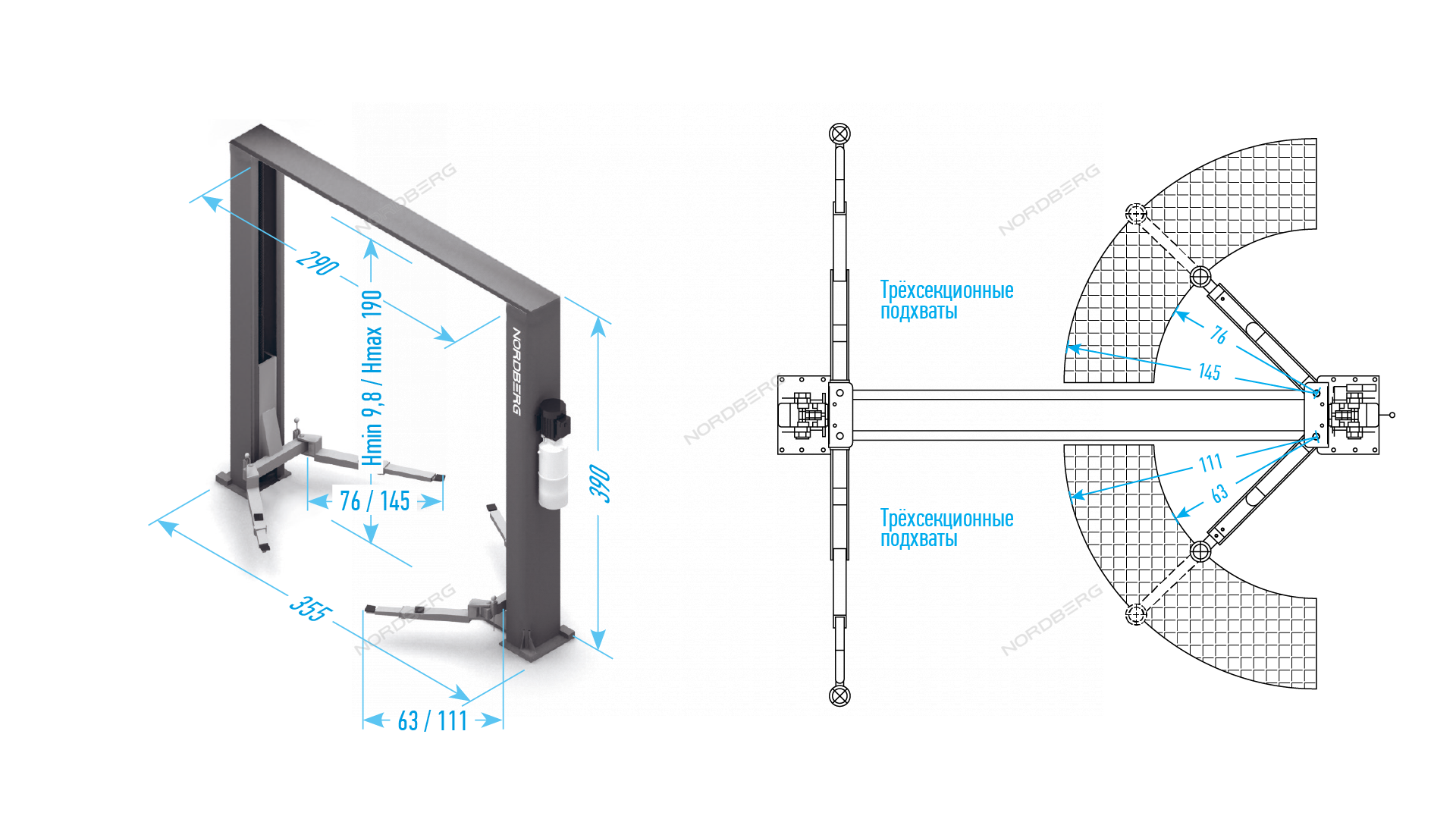Подъемник 2-стоечный 4 т, с верхней синхронизацией, снятие со стопоров с одной колонны, 380 В, серый NORDBERG N4122HM-4G