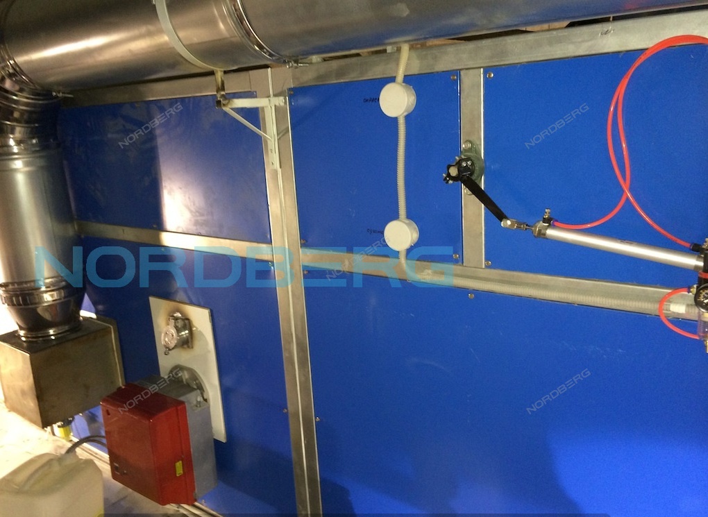 воздух забирается спереди камеры сверху, выброс отработанного воздуха в центре камеры вверх. Каркас изготовлен из квадратной стальной трубы, снаружи – окраска синяя, внутри гальванизирован