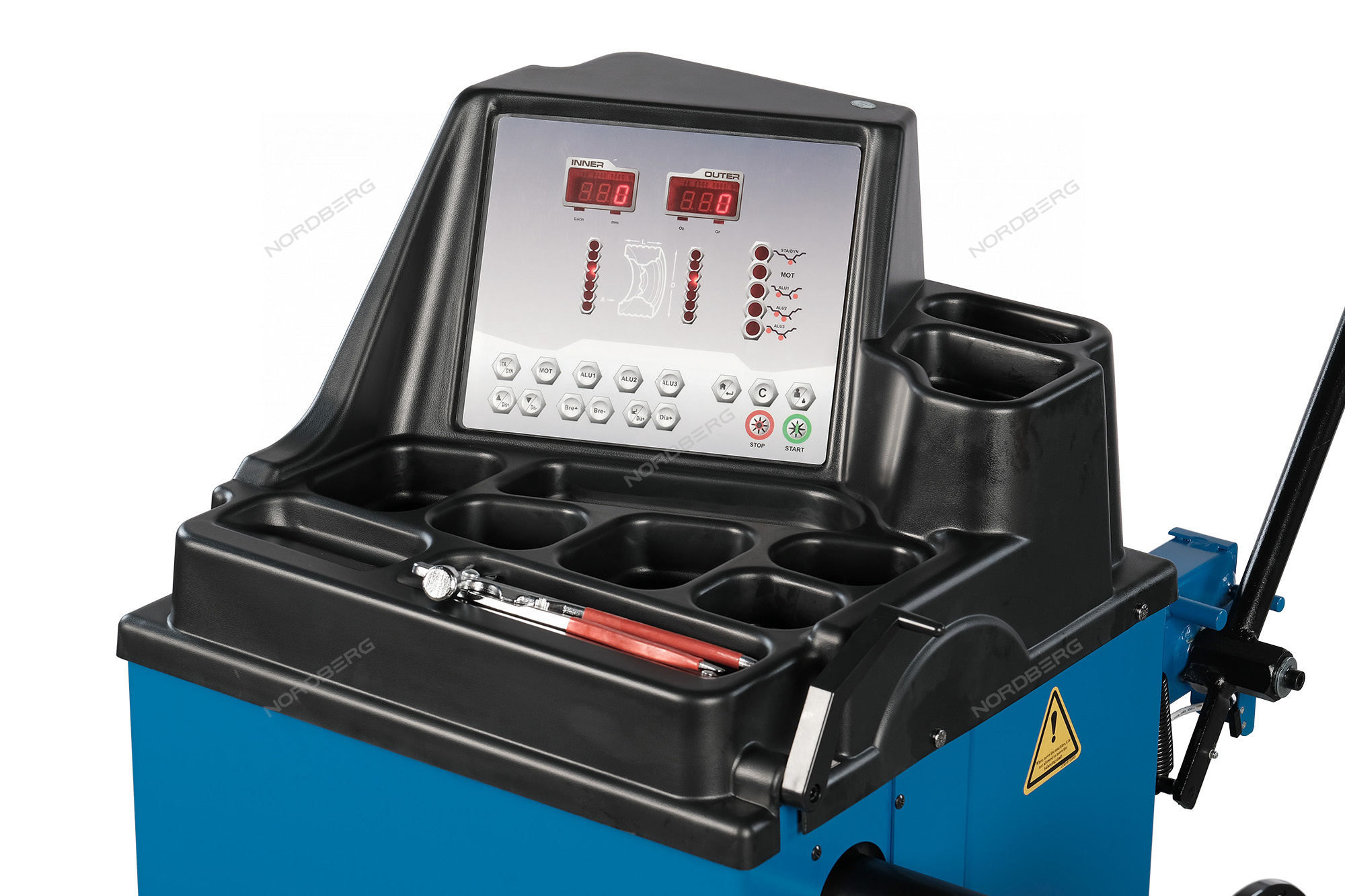Станок балансировочный с ручным вводом параметров, синий NORDBERG 4524С предназначен для балансировки легковых автомобилей и легких грузовиков.
