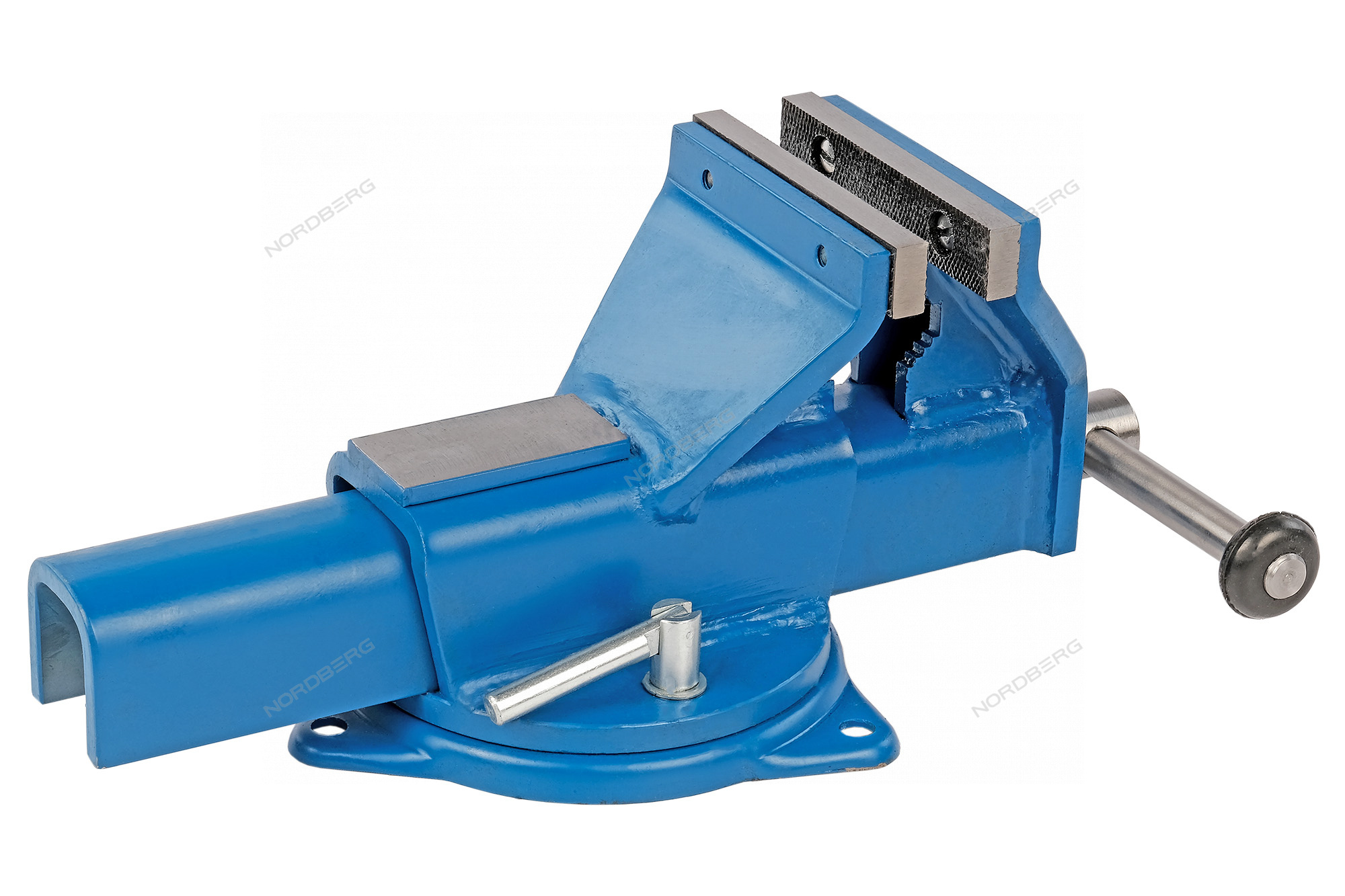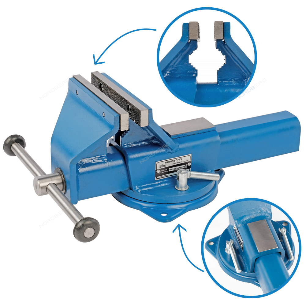 Основание тисков имеет поворотный механизм 360°, фиксация с помощью удобных 2-х зажимных винтов