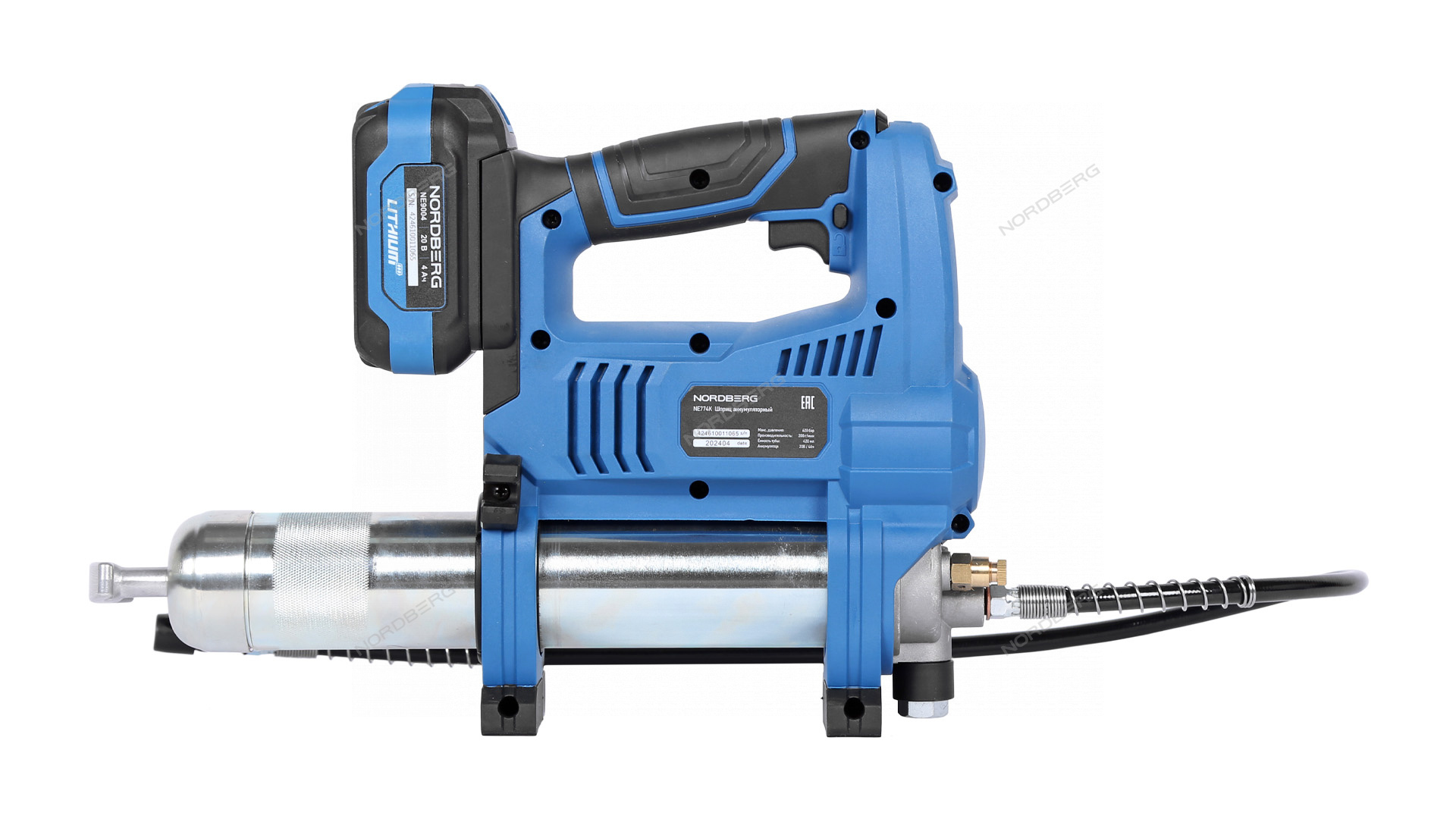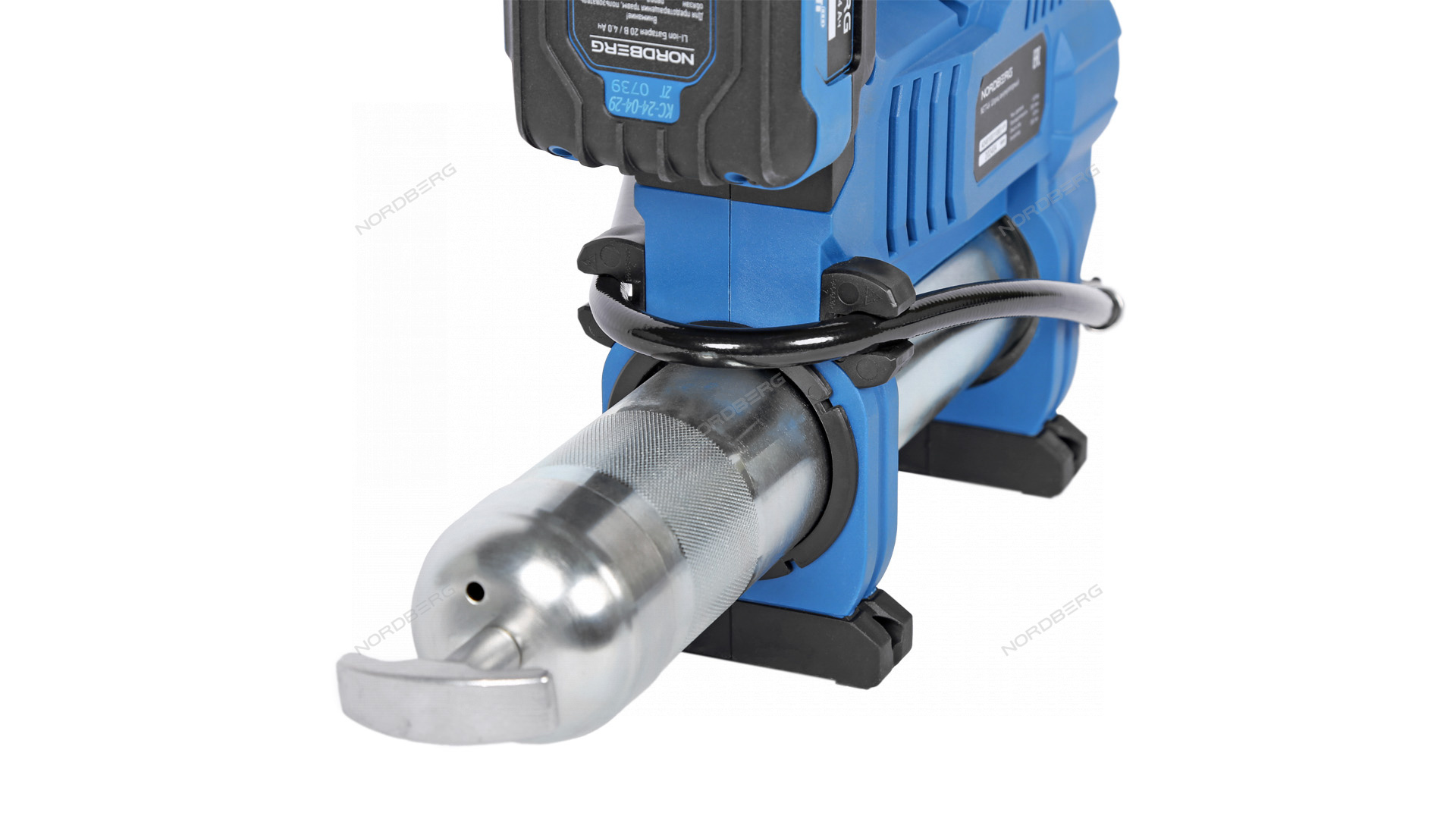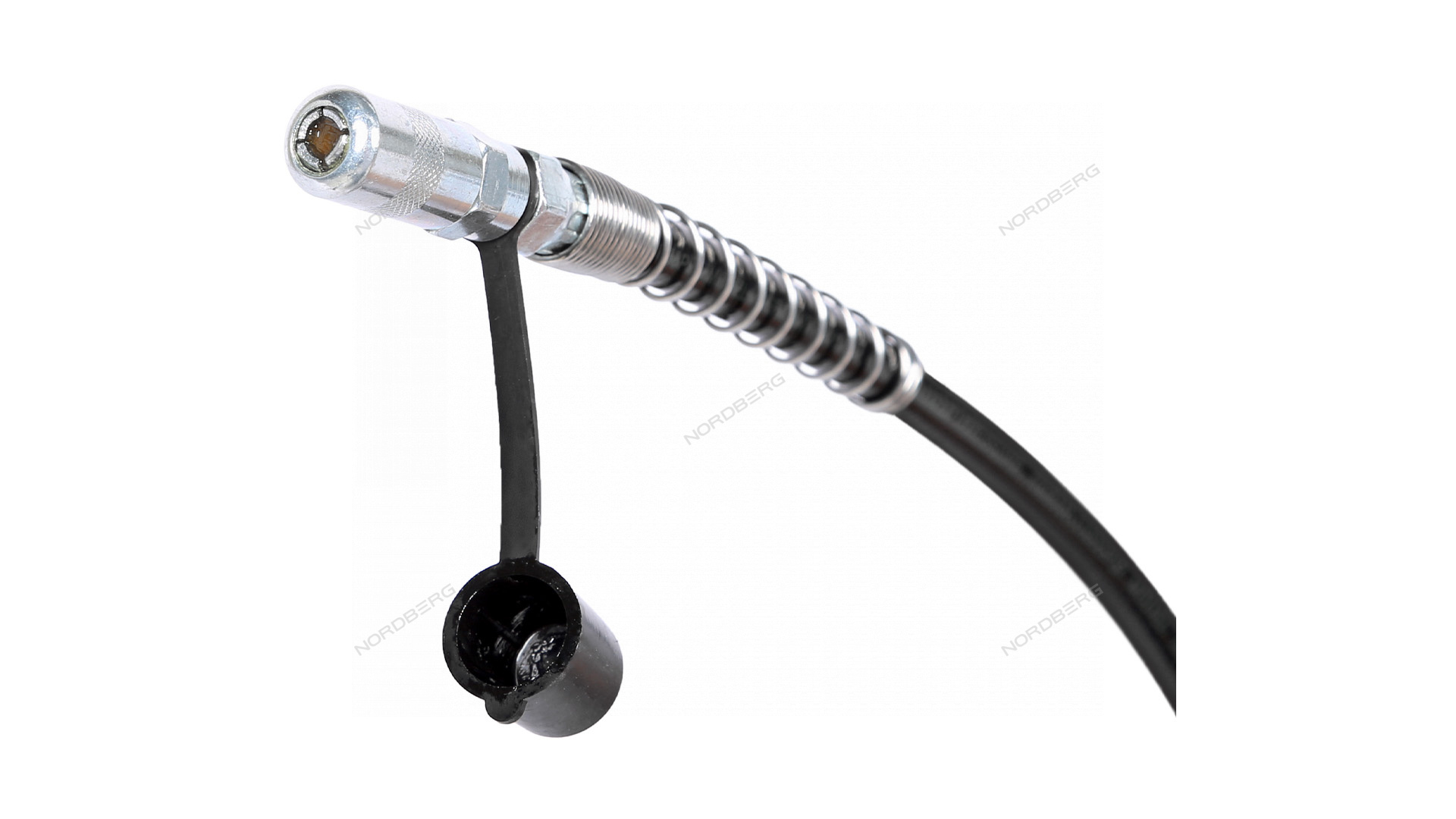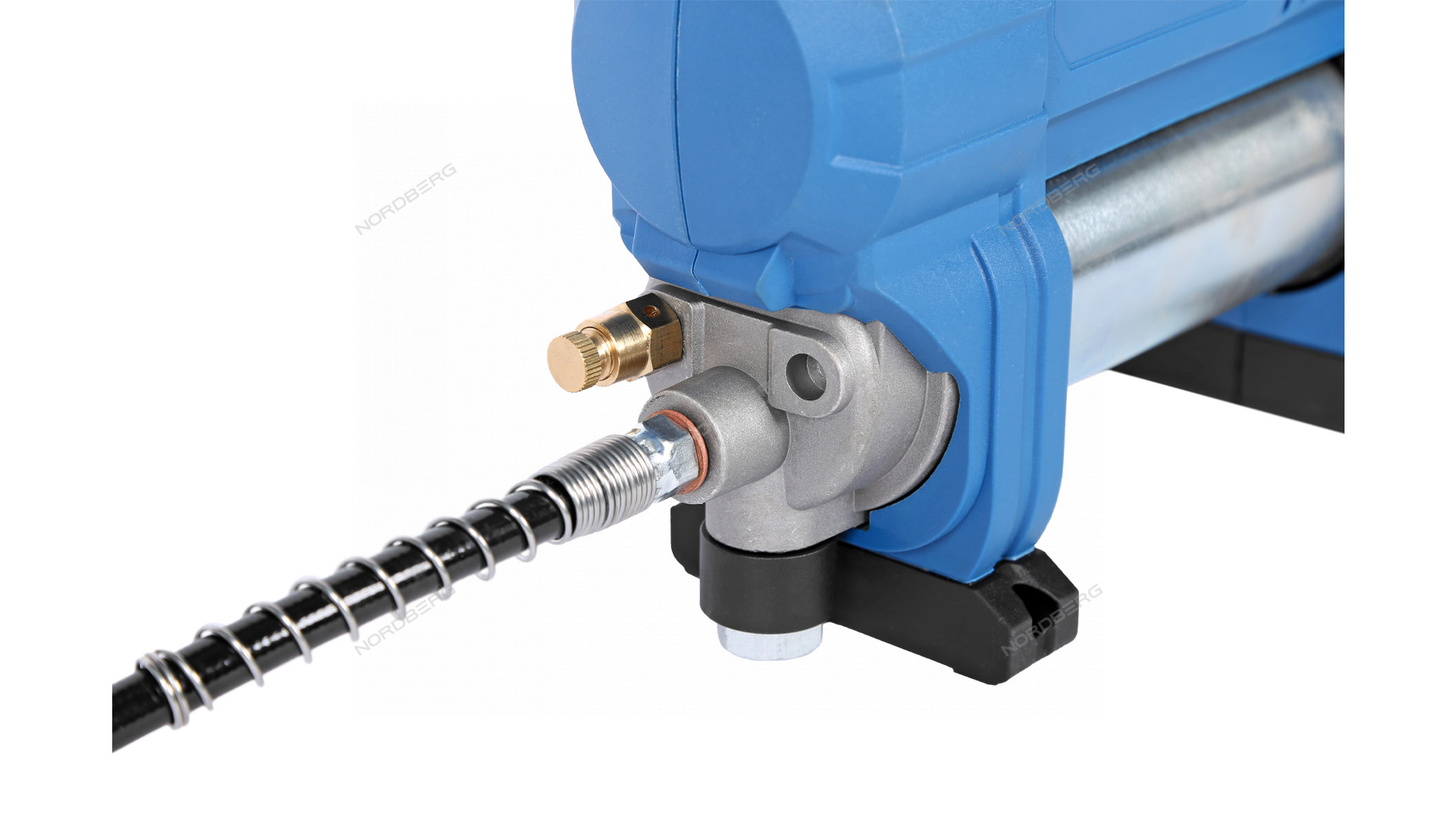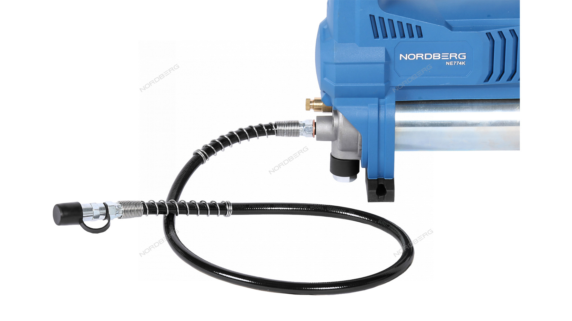 Гибкий шланг подачи смазки с защитой в виде пружины от блокирующих смазку “перегибов”, позволяет работать в ограниченном пространстве