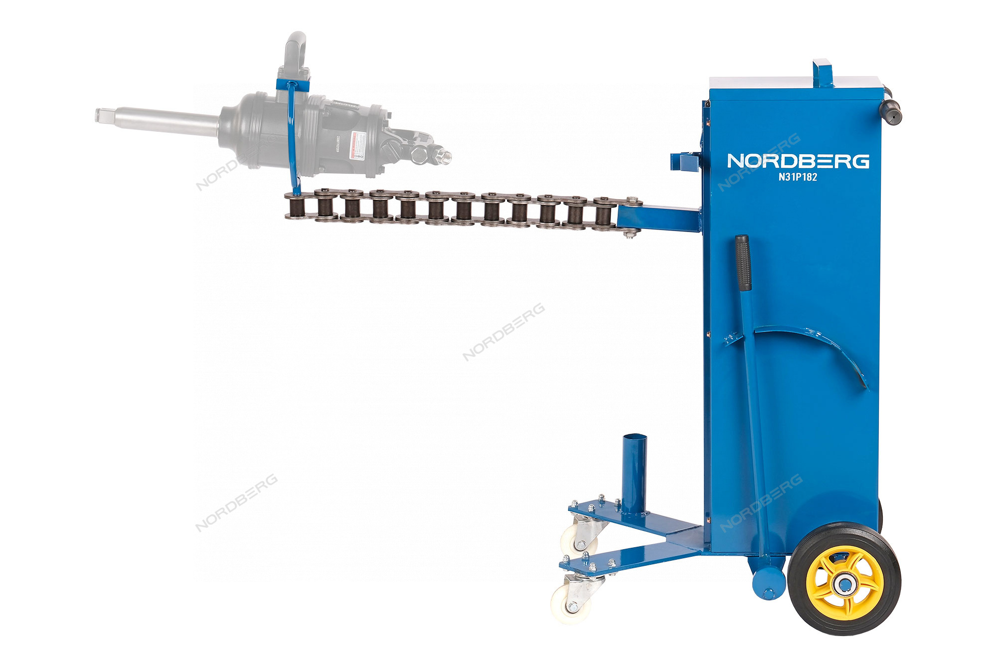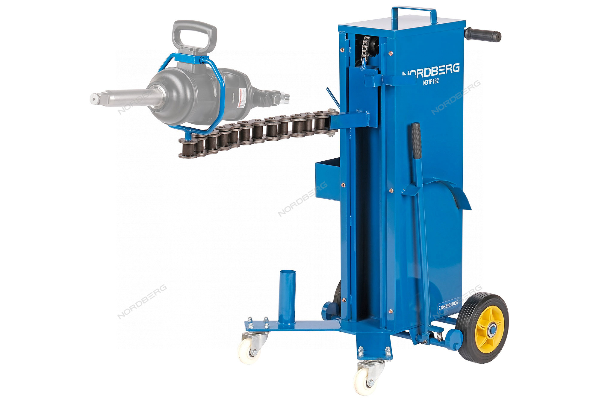 Тележка-держатель с цепью для пневмогайковерта NORDBERG N31P182 – вспомогательное оборудование для совместного использования с пневматическими инструментами на автотранспортных предприятиях, станциях шиномонтажа, в автосервисах.