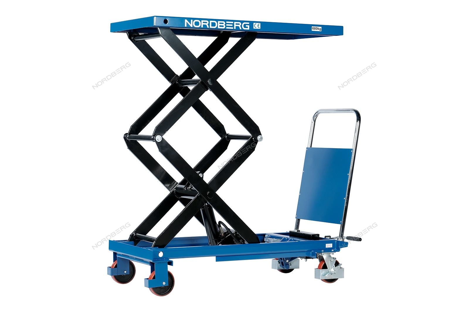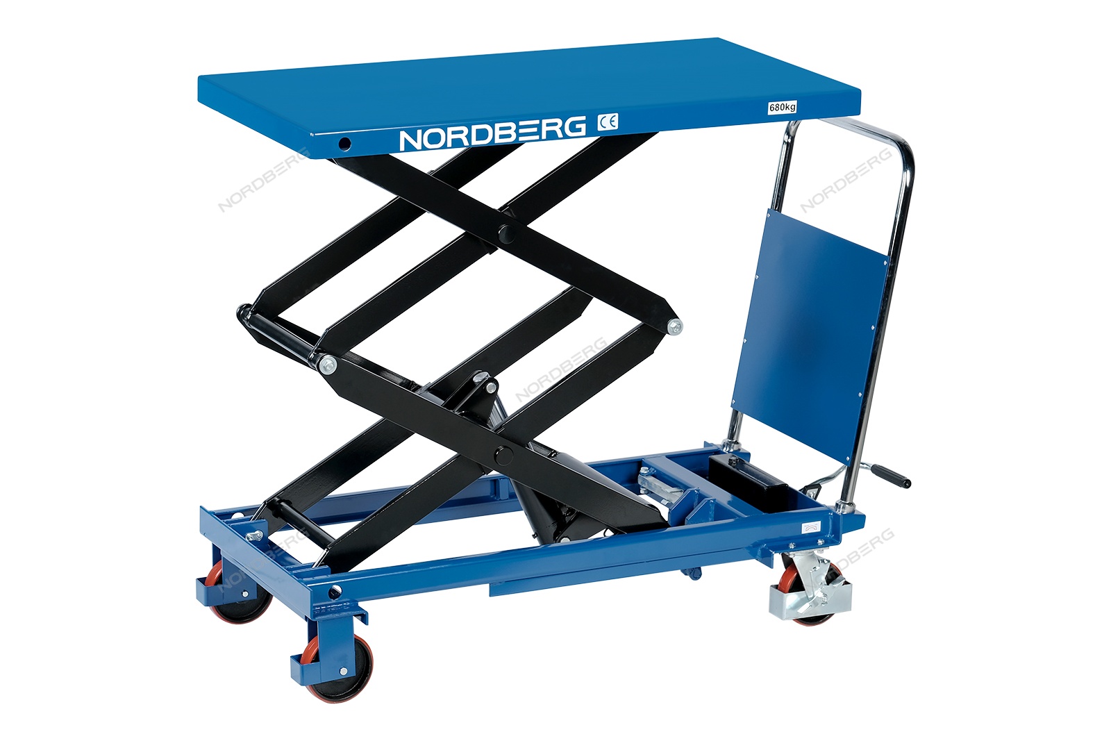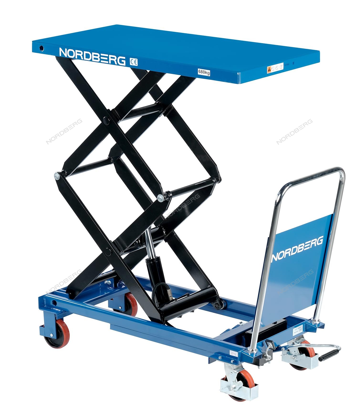 Подъемный гидравлический стол N3T680 предназначен для подъема, опускания и перемещения груза. Конструкция представляет собой совмещение платформенной тележки и стационарного подъемного стола. Подъемный стол имеет гидравлический ножной привод, который позволяет произвести быстрый подъем груза. Опускание производится путем нажатия рычага на ручке подъемного стола. Подъемный стол оснащен стопором, который позволяет надежно закрепить положение в поднятом состоянии. Гидравлическая система позволяет столу опускаться плавно, обеспечивая безопасность работ с грузами. Тележки с подъемным столом с ручным приводом мобильны, эффективны и надежны. Они позволяют не только приподнимать грузы, но и перемещать их на расстояния.